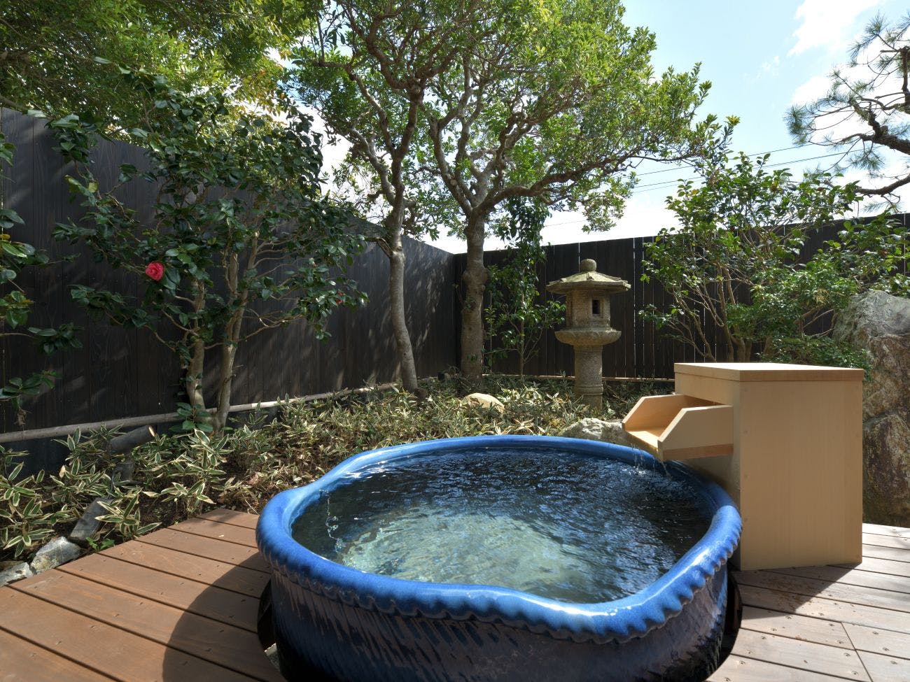 庭園のウッドデッキに開放的な露天風呂6畳のこじんまりとした和のリビングから繋がる、広々とした庭園に備えた開放的な温泉露天風呂。趣のある信楽焼の湯船に浸かりながら、名湯「修善寺温泉の湯」と庭園の眺めを心ゆくまでお楽しみください。随所に意匠を凝らした寝室では、深い眠りで体を休めてください。※喫煙は所定の喫煙所にてお願いいたします。