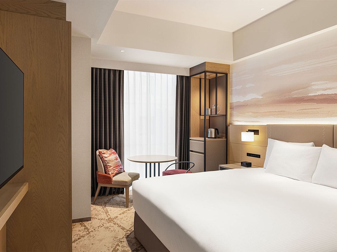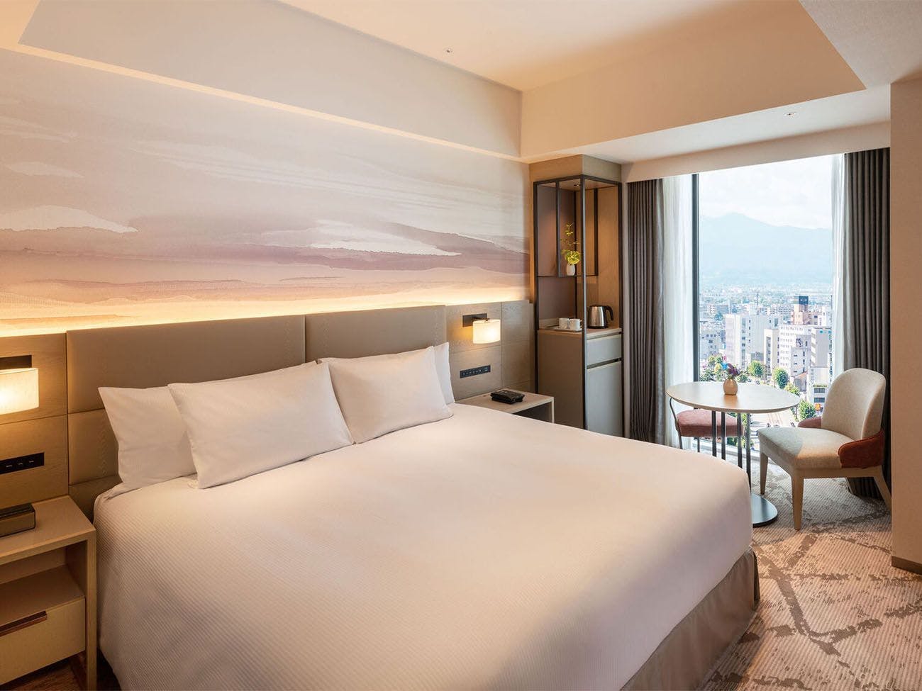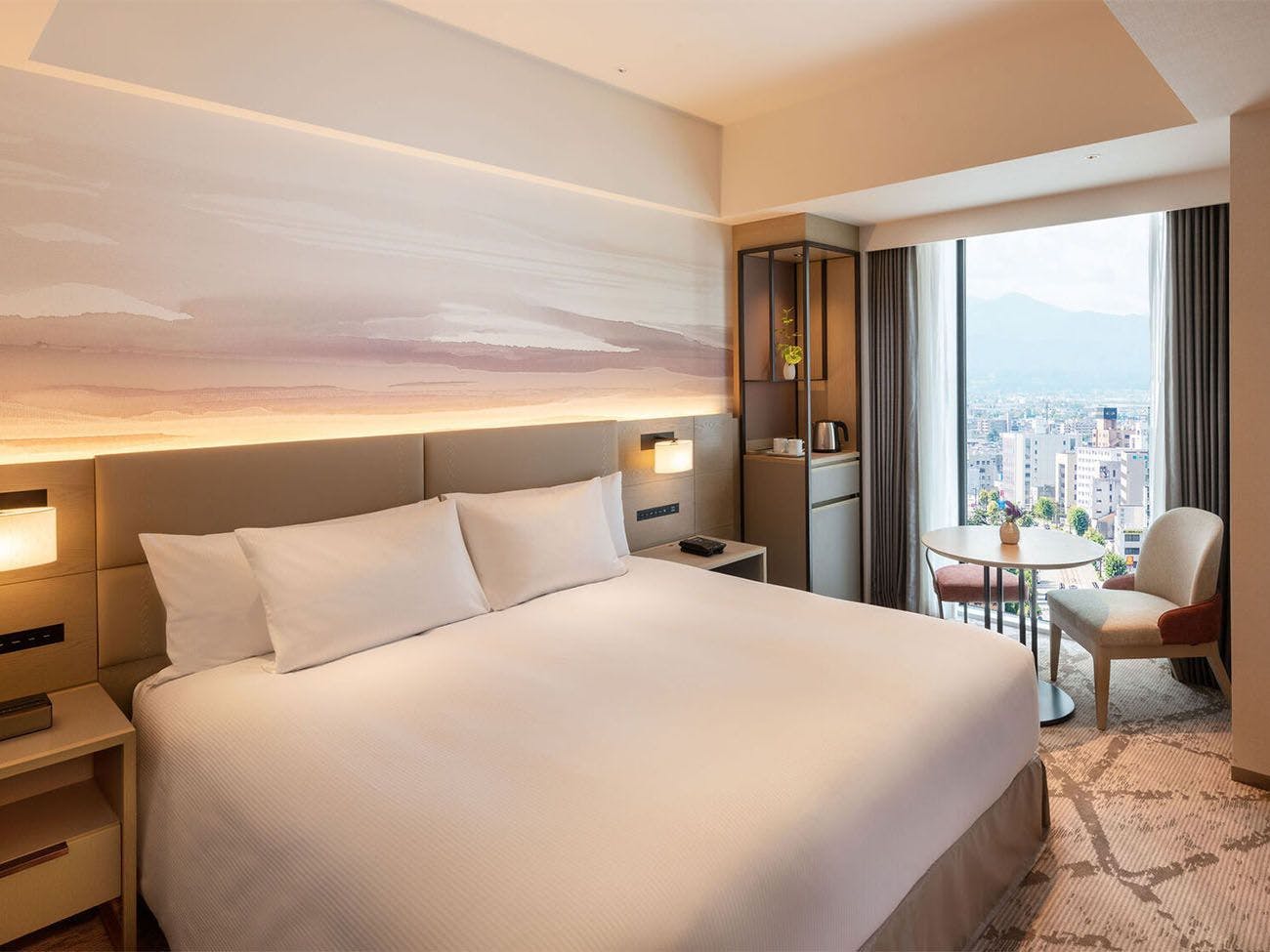 キングサイズベッド1台、55インチのHDテレビ、WiFiを備え、立山連峰をモチーフにしたコンテンポラリーなインテリアと快適性を兼ね備えた寛ぎの空間です。備え付けのベッド1台を引き出すと最大3名様までご利用いただけます。お部屋にネスプレッソマシンをご用意しております。