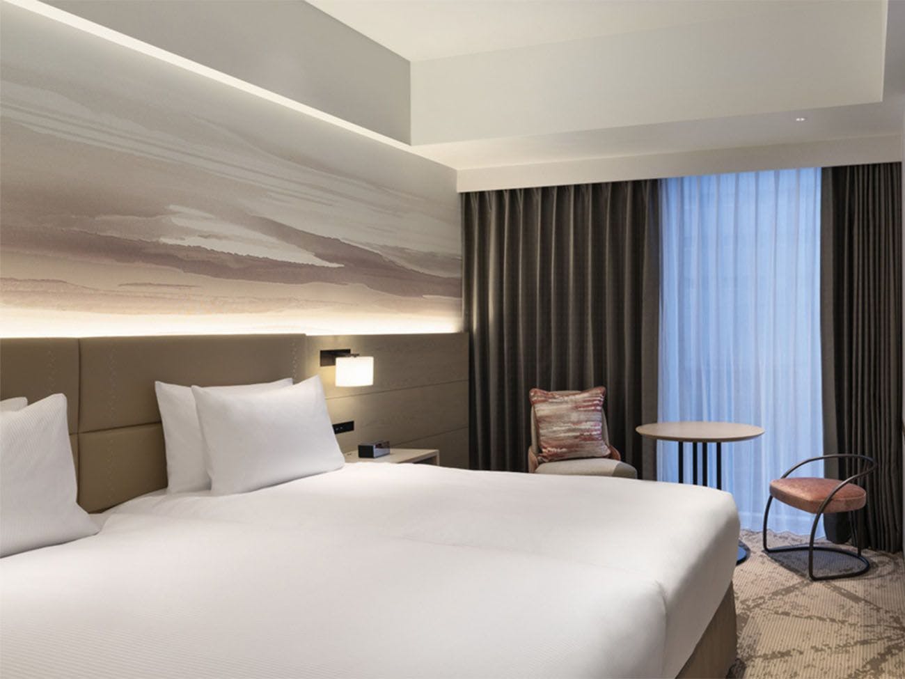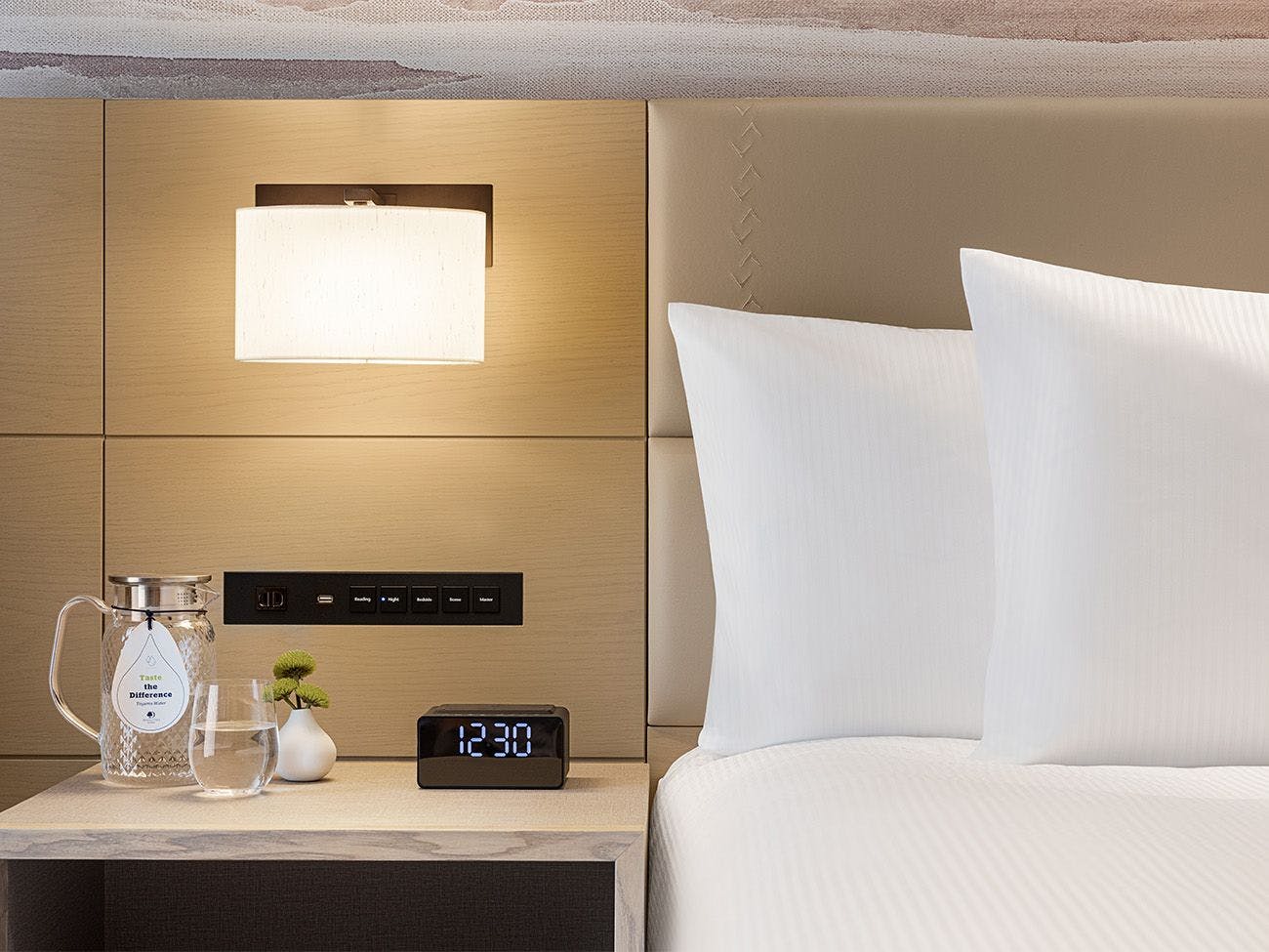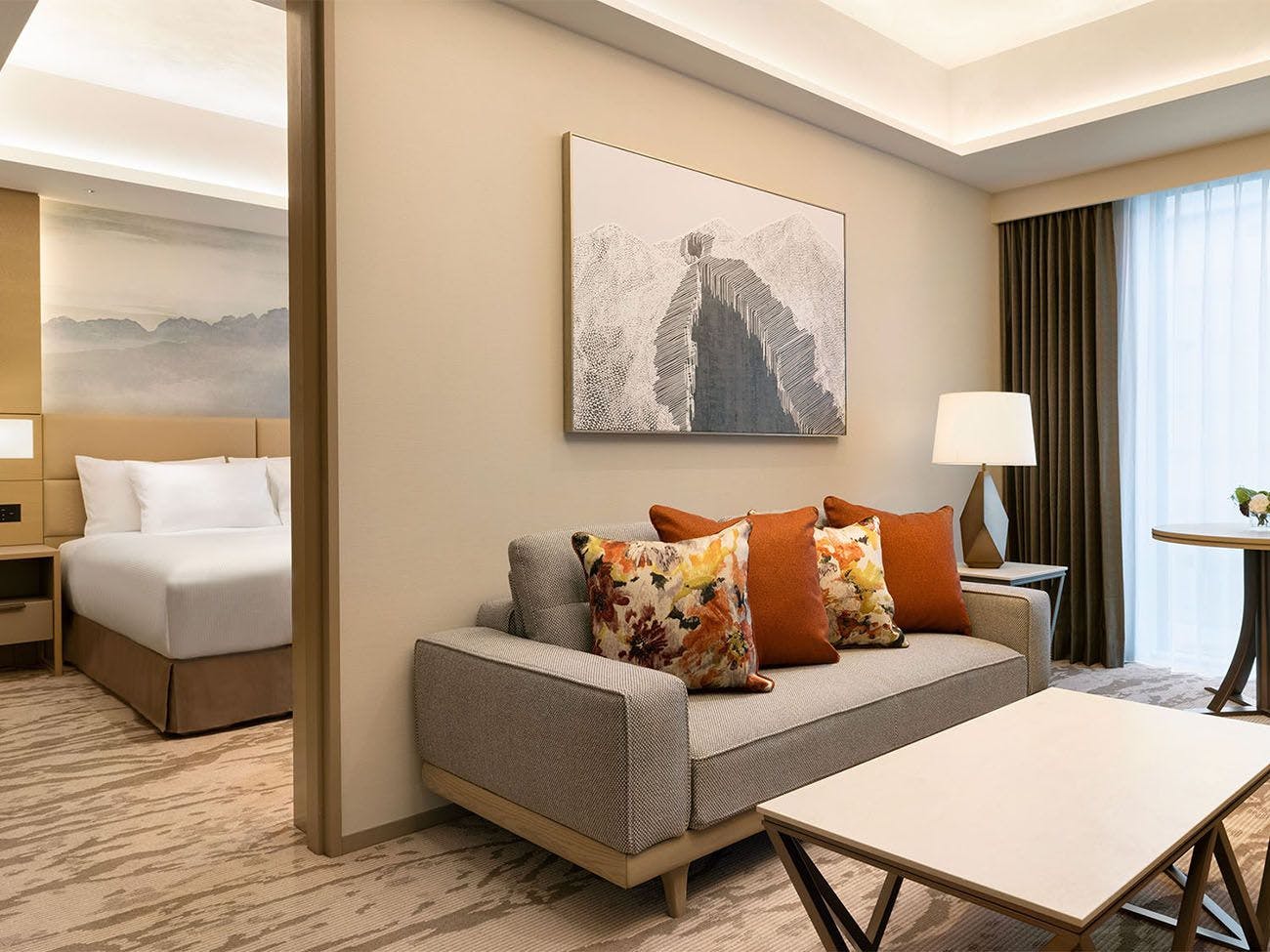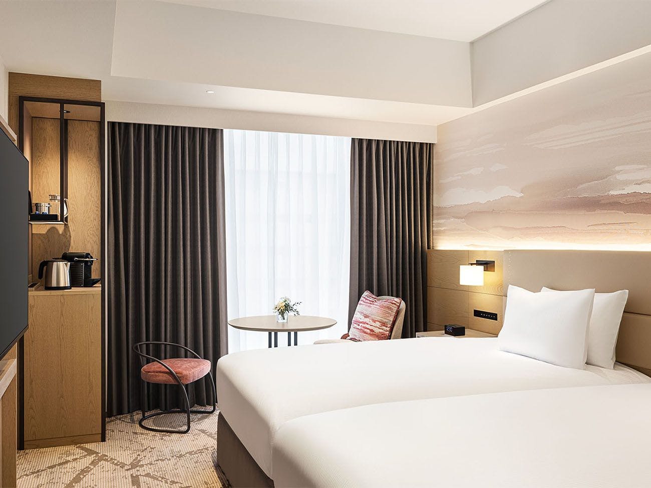 キングサイズベッド1台、55インチのHDテレビ、WiFiを備え、立山連峰をモチーフにしたコンテンポラリーなインテリアと快適性を兼ね備えた寛ぎの空間です。備え付けのベッド1台を引き出すと最大3名様までご利用いただけます。お部屋にネスプレッソマシンをご用意しております。