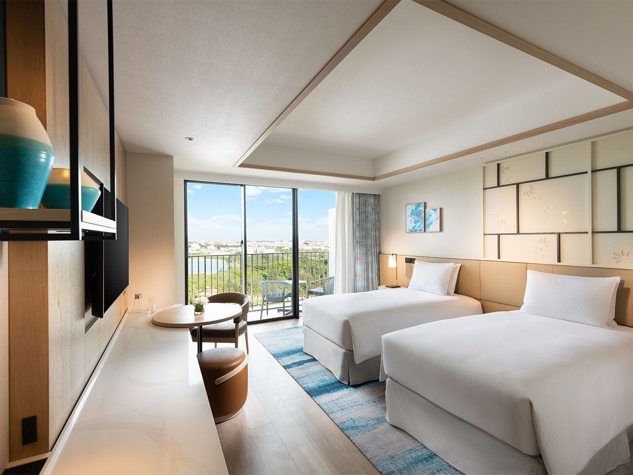 ホテル3階から6階に位置し、プライベートバルコニーからは豊かな緑と遠くに広がる街並みを望みます。宮古ブルーの海をデザインに取り入れた自然光があふれる客室で、ツインベッド2台、トイレとセパレートになったバスルーム、ヒルトンならではの上質なアメニティーを備えています。ゆったりと心地よいひとときをお過ごしください。