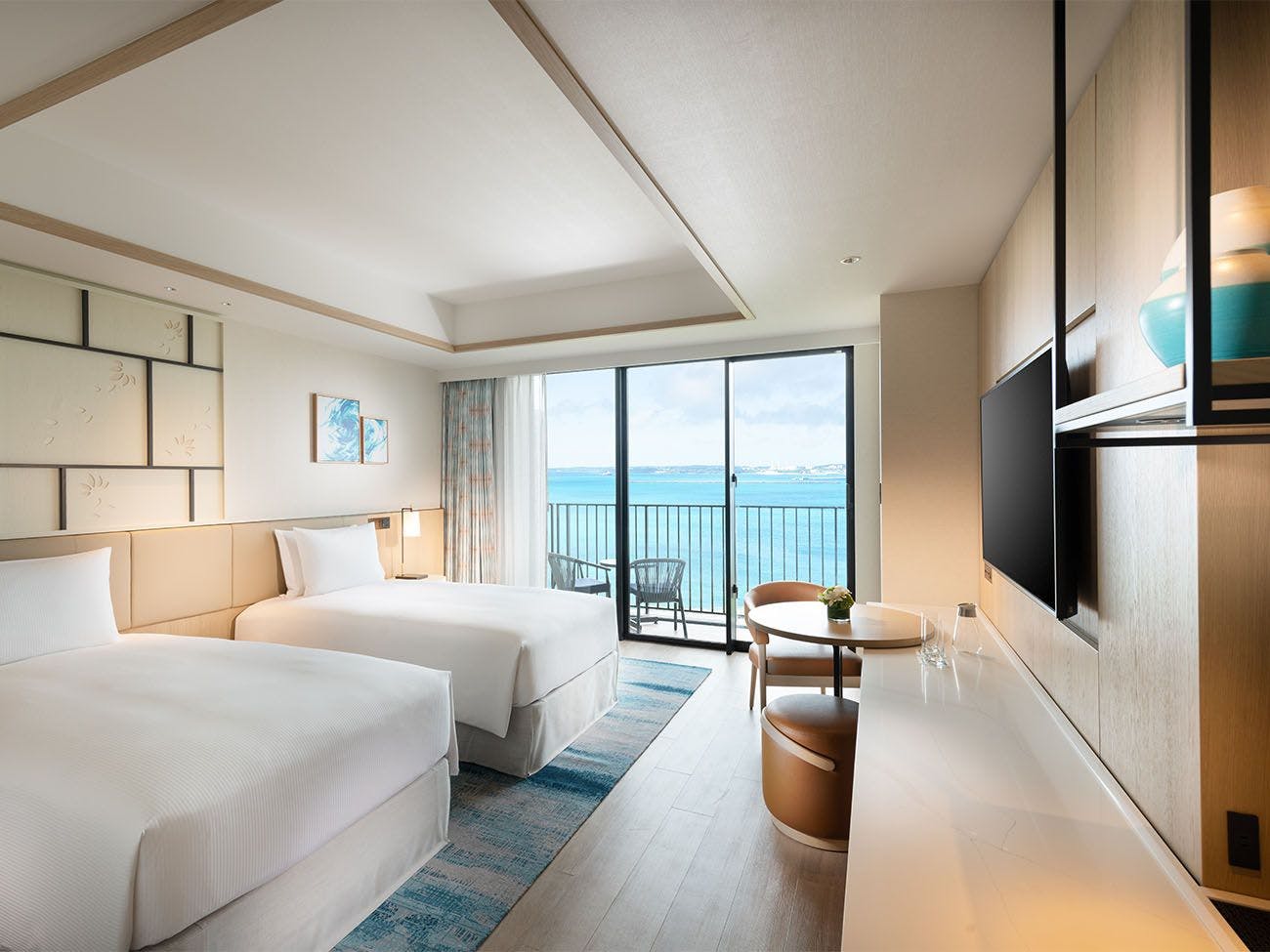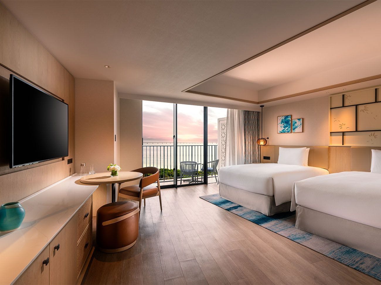 ホテル3階から6階に位置し、プライベートバルコニーからはトゥリバーマリーナやパイナガマビーチ方面を望みます。宮古ブルーの海をデザインに取り入れた自然光があふれる客室で、ツインベッド2台、トイレとセパレートになったバスルーム、ヒルトンならではの上質なアメニティーを備えています。ゆったりと心地よいひとときをお過ごしください。