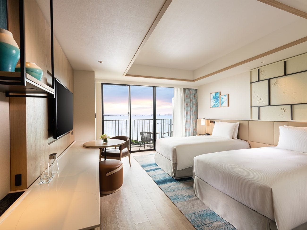 ホテル4階から6階に位置し、プライベートバルコニーからは伊良部大橋全景とオーシャンビュー、美しいサンセットを望みます。宮古ブルーの海をデザインに取り入れた自然光があふれる客室で、ツインベッド2台、トイレとセパレートになったバスルーム、ヒルトンならではの上質なアメニティーを備えています。ゆったりと心地よいひとときをお過ごしください。