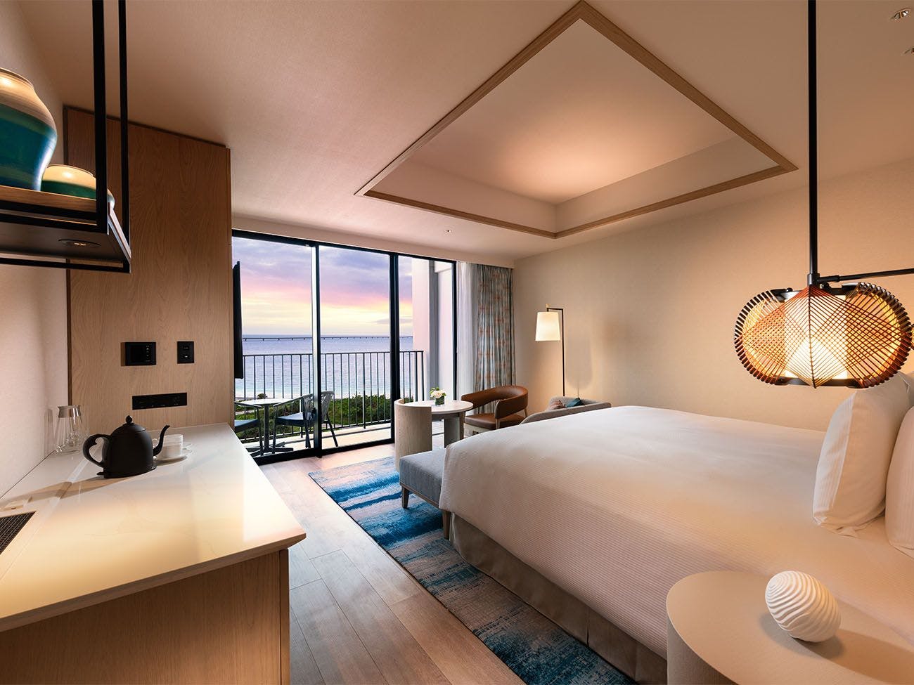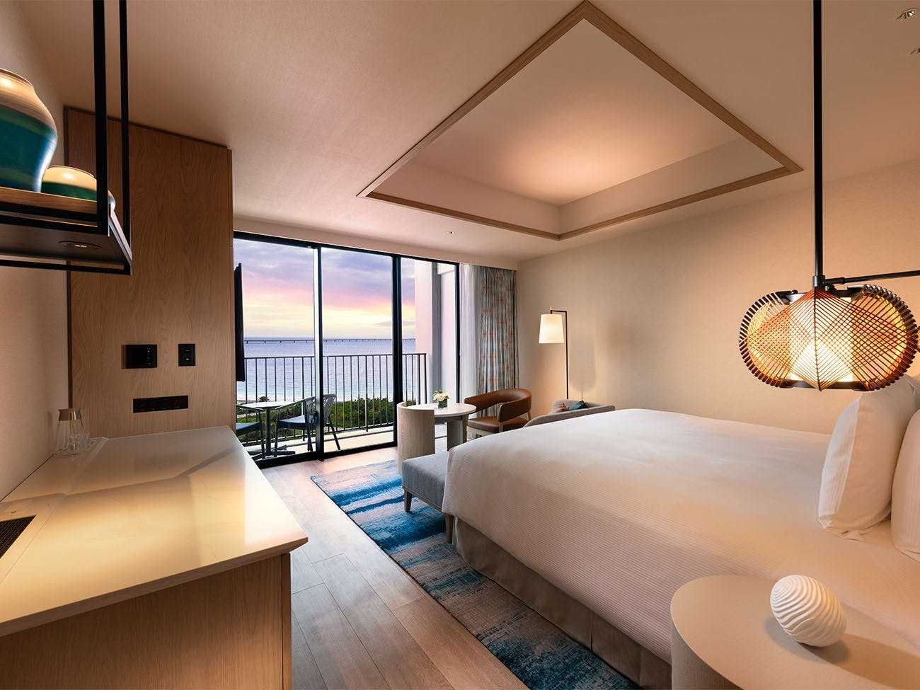 ホテル4階から6階に位置し、プライベートバルコニーからは伊良部大橋全景とオーシャンビュー、美しいサンセットを望みます。宮古ブルーの海をデザインに取り入れた自然光があふれる客室で、キングベッド、トイレとセパレートになったバスルーム、ヒルトンならではの上質なアメニティーを備えています。ゆったりと心地よいひとときをお過ごしください。