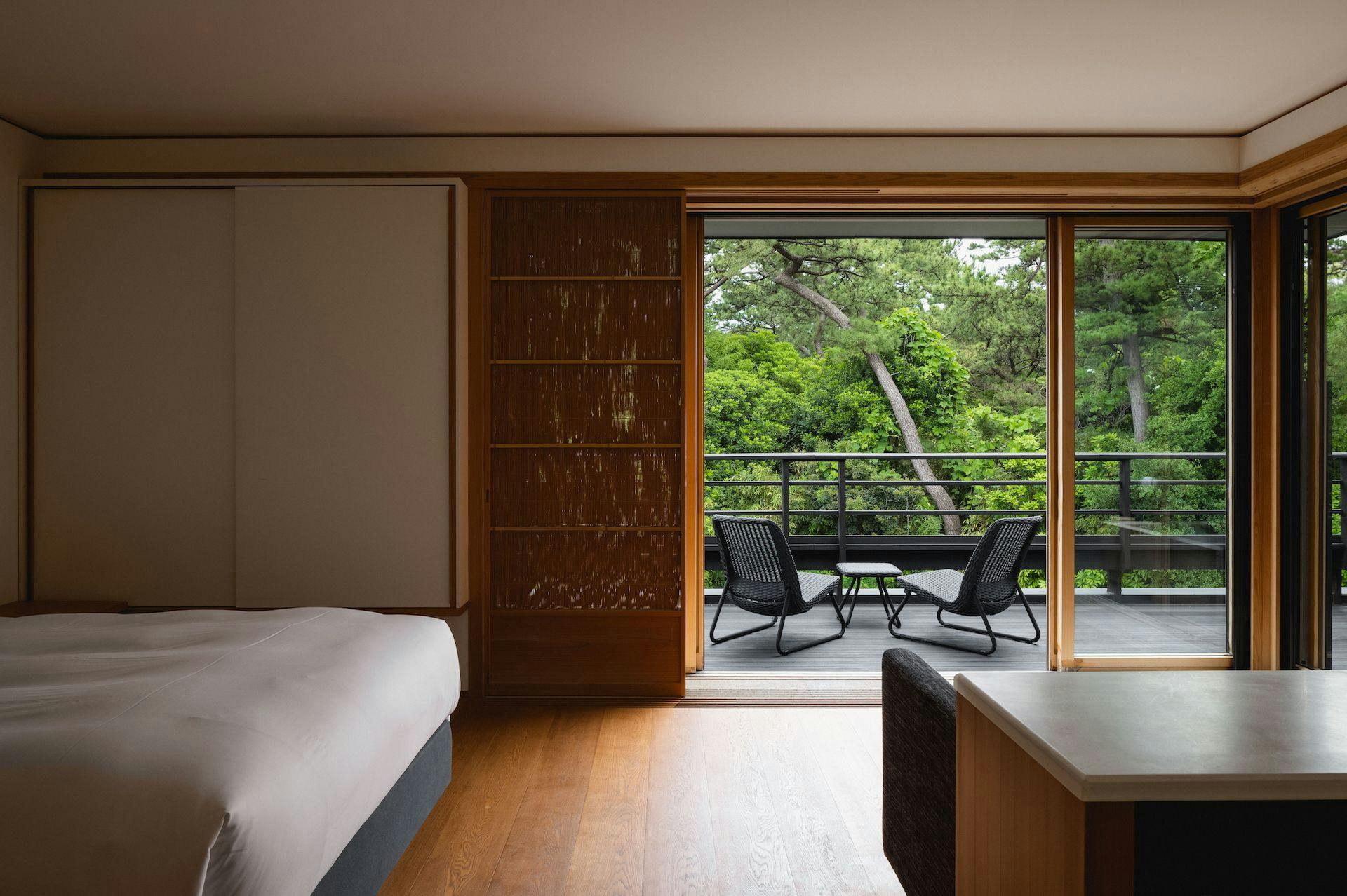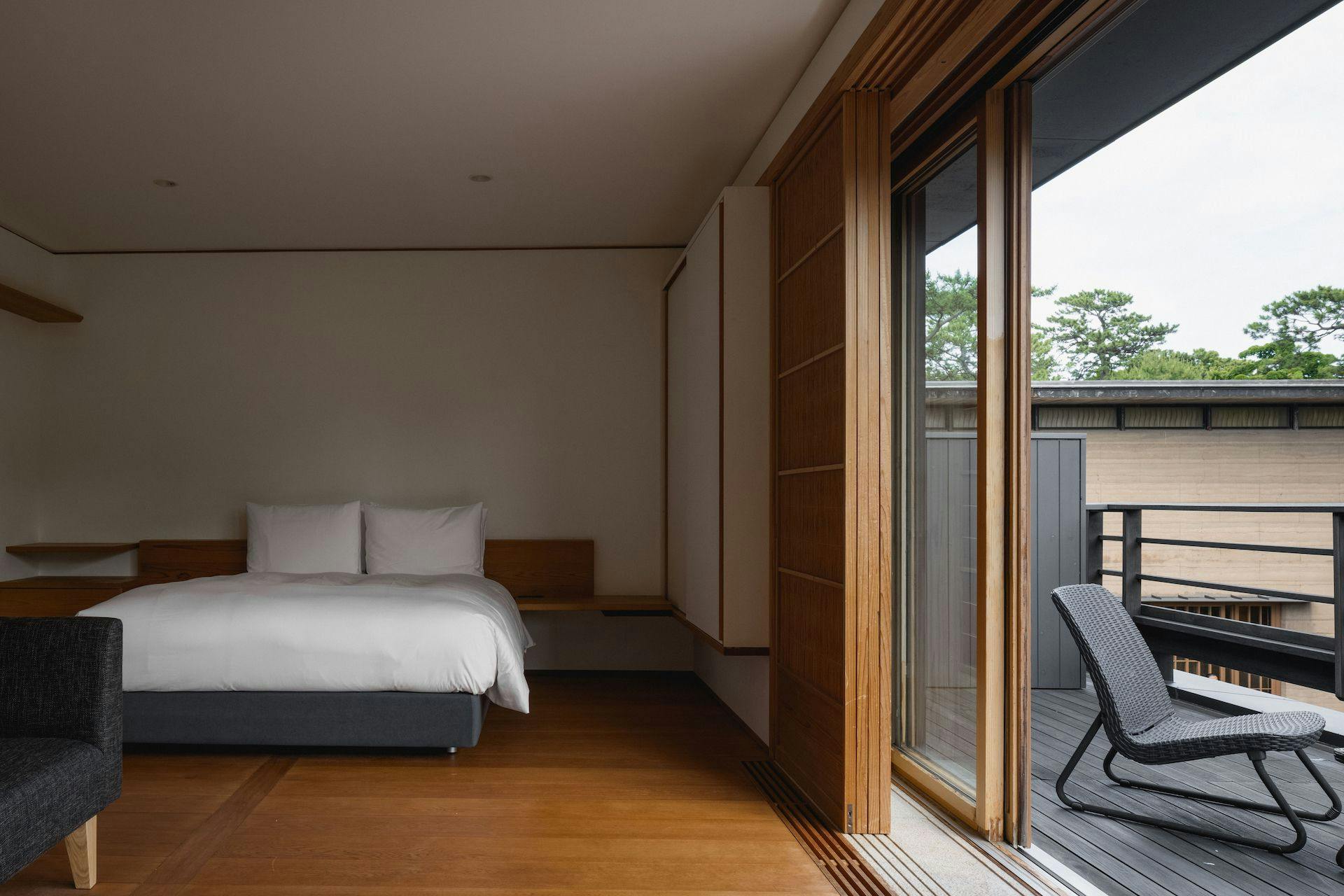 クイーンサイズのダブルベッドを備えた2階に位置するお部屋です。松林を一望できる広々としたバルコニーの一角には露天風呂を設けています。あたたかな光がお部屋全体にさし込み、ゆったりとお寛ぎいただけます。※こちらの客室はお子さま(12歳以下)はご利用いただけません。※こちらの客室にはテレビは設置しておりませんので予めご了承ください。
