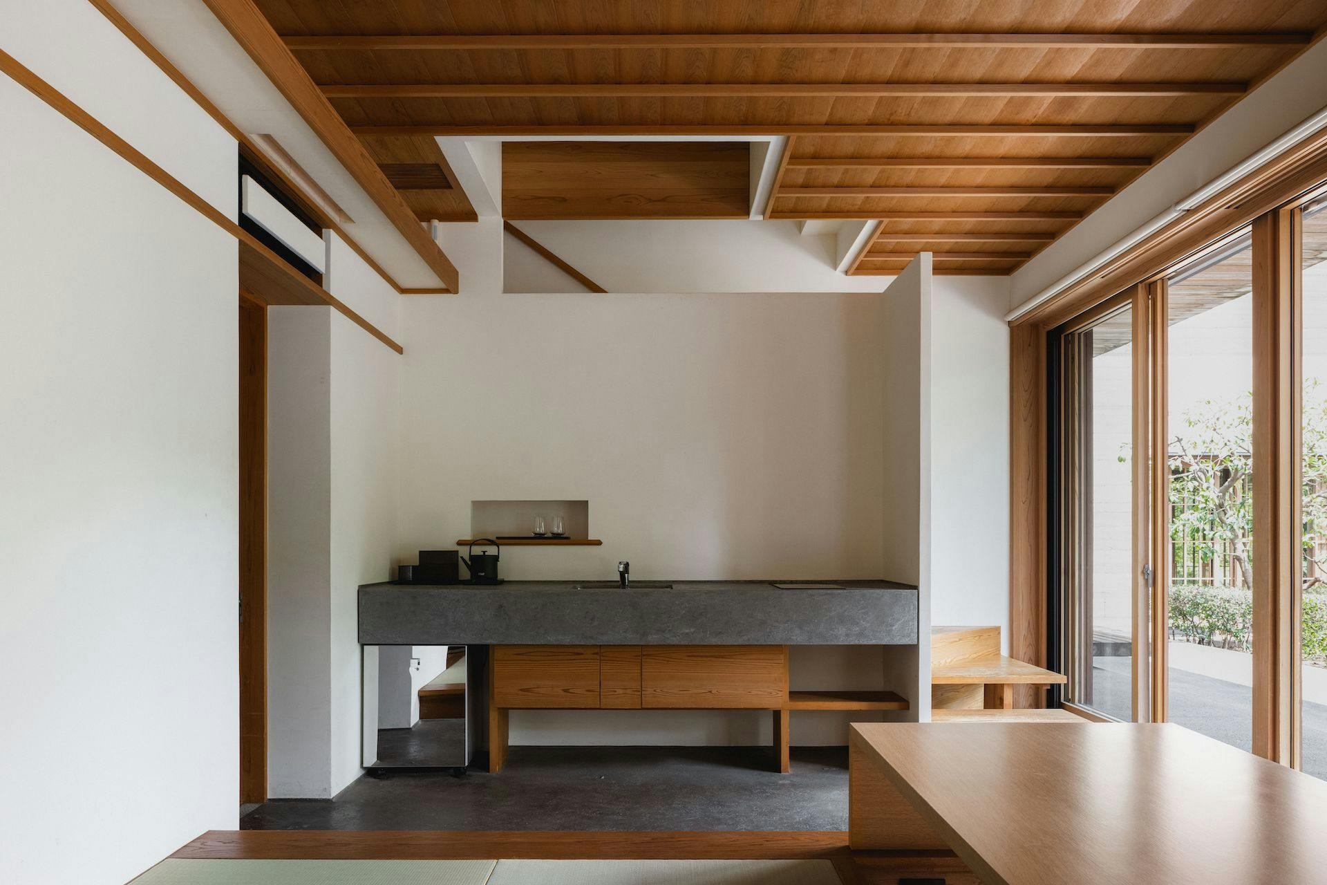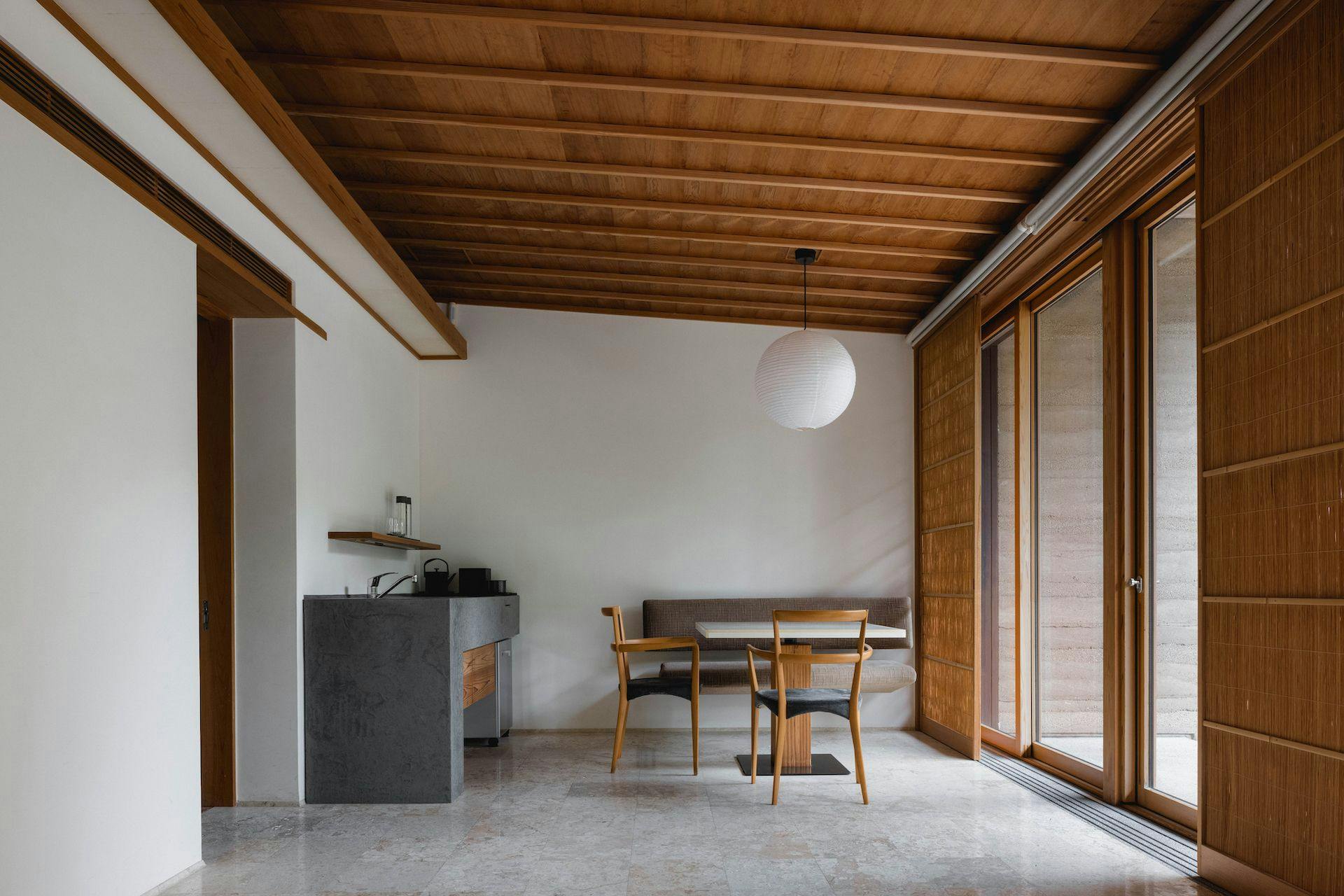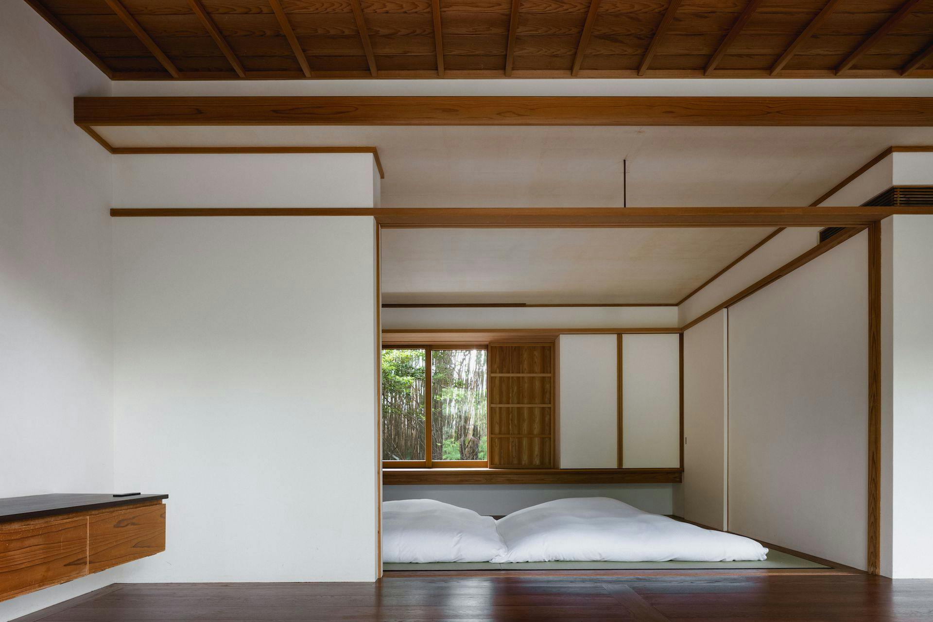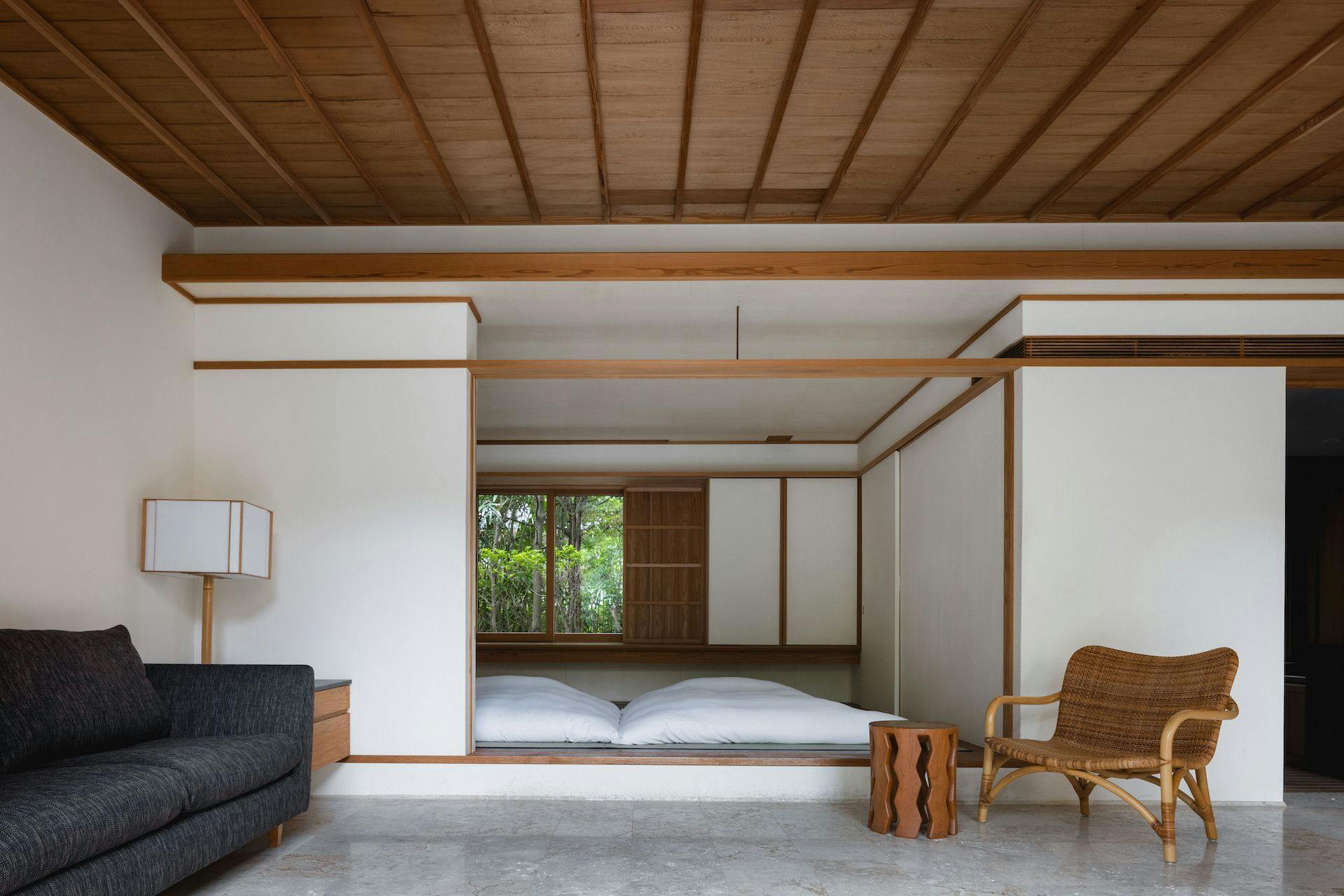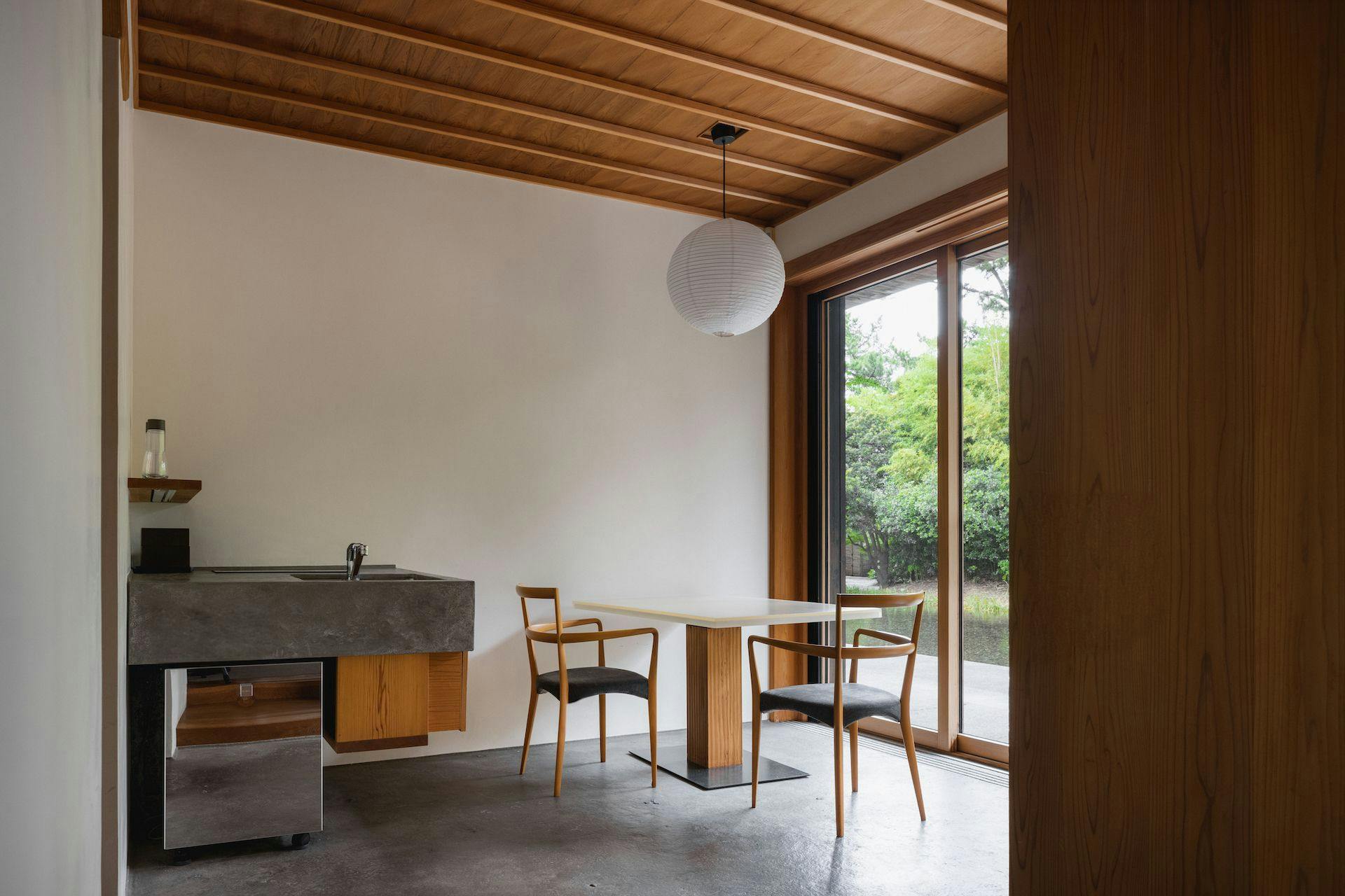 眼前に水盤と松林を望む1階の小上りでは、刻々と変化する水面を眺めながら、ゆっくりとお茶や読書を。内階段から2階へ上がったバルコニー付きのベッドルームでは、心地よく身体を休めることができます。長期滞在にも相応しい居住性のあるお部屋です。