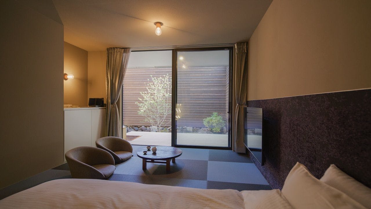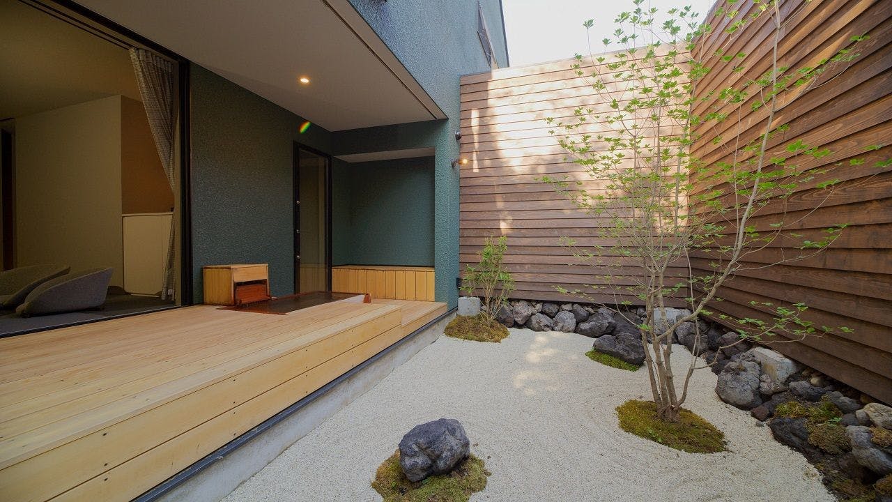 畳に寝ころびながら庭を眺め、庭のウッドデッキ横の風呂に浸かる。体が温まったら庭で涼み また浸かる。黒と茶をメインカラーにしたお部屋で、ゆっくりと時の流れお楽しみください。