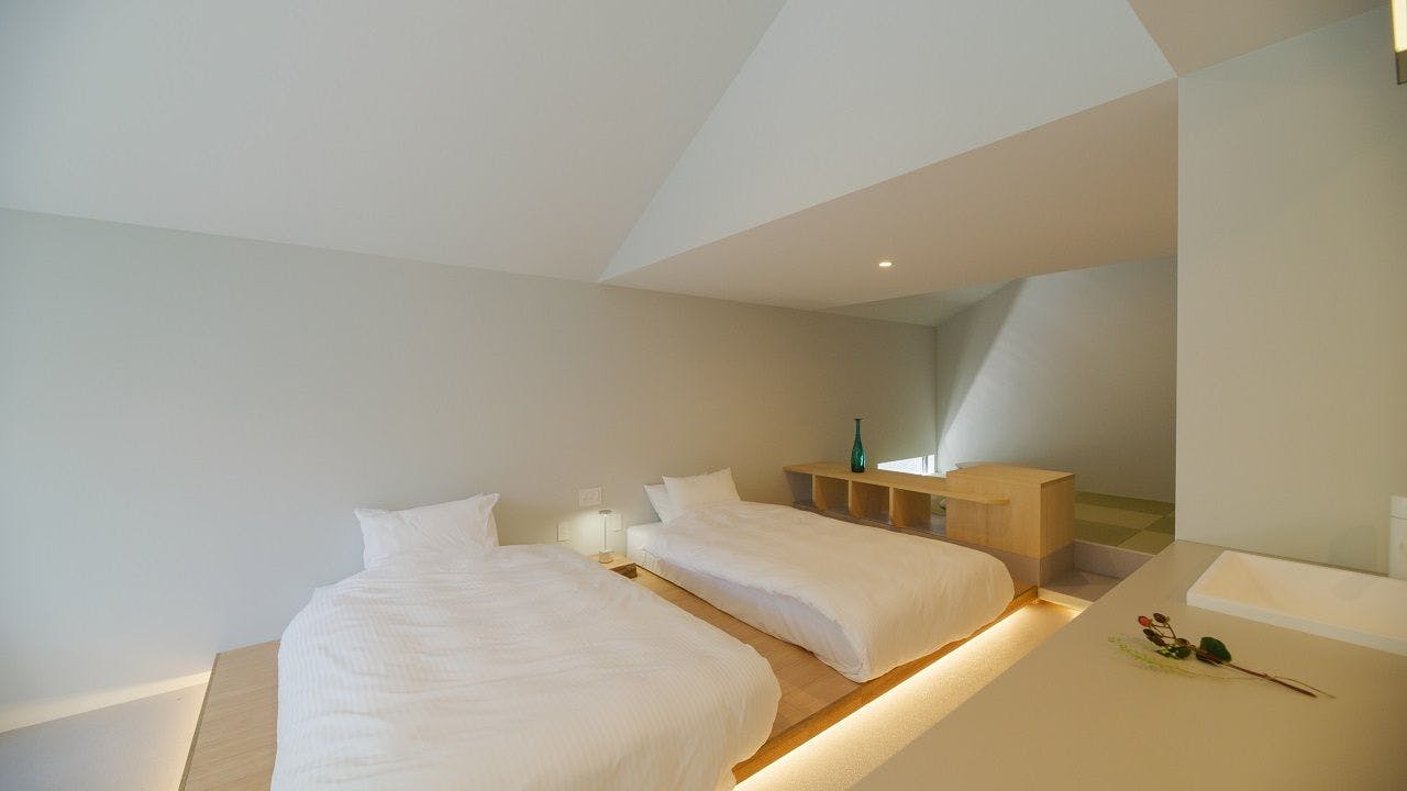 お部屋中央にクイーンベットを配置し、うたた寝しながらお風呂と庭を愉しむ。白と赤を基調としたお部屋で、草津温泉と優雅な時をお楽しみください。