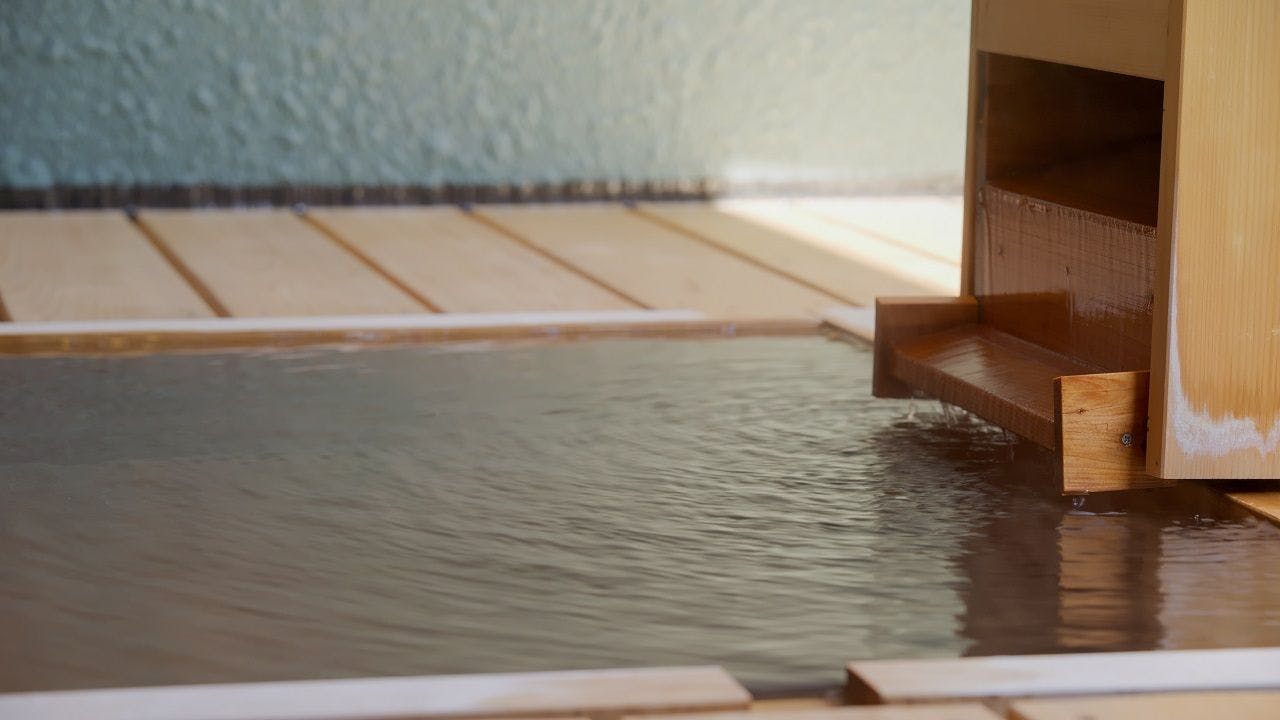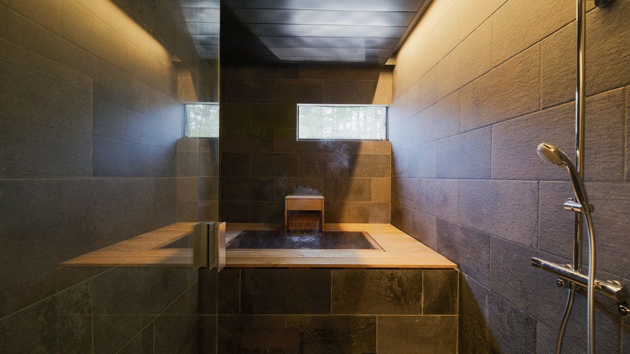 区切りのない広々とした空間。源泉かけ流しのヒノキ風呂付。ヒノキ香で癒されながらの入浴・足湯。窓の外には緑が生い茂る。白と緑を基調とした和洋室で、日本文化をお愉しみください。