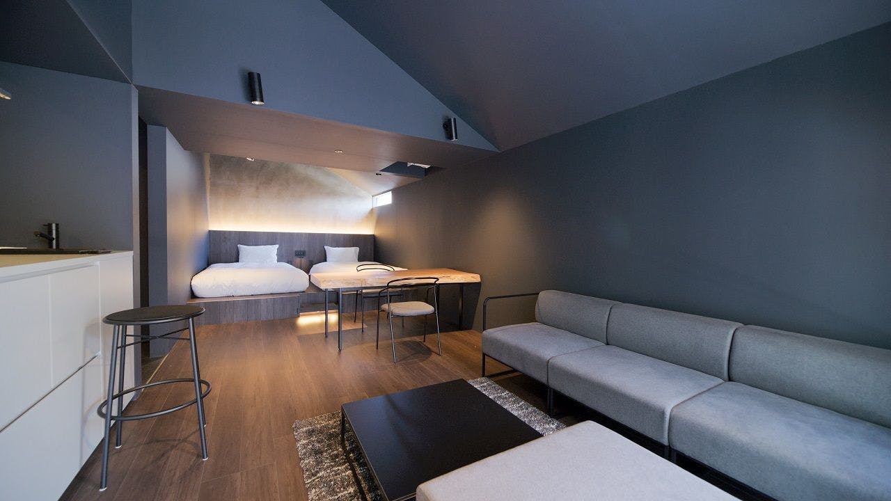 Barに泊まるをコンセプトとした開放感のある真っ黒の部屋。