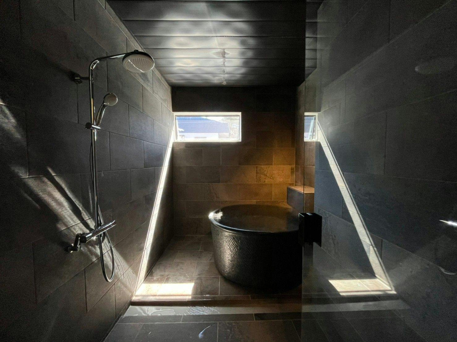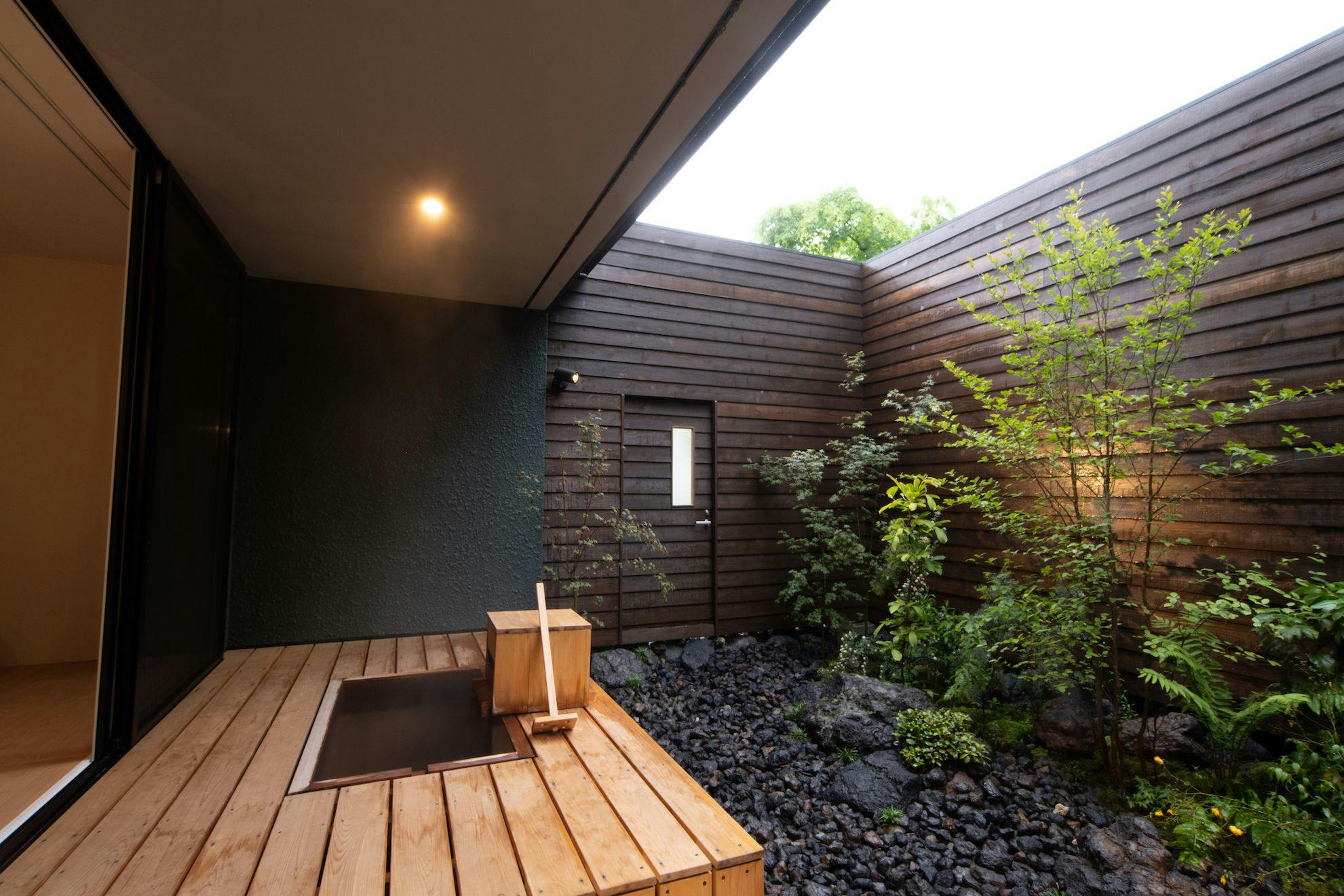 桜の1枚板のテーブルでお酒を愉しみ、真っ黒な陶器風呂で癒される。非日常を感じるどこにもないブラックスイート。