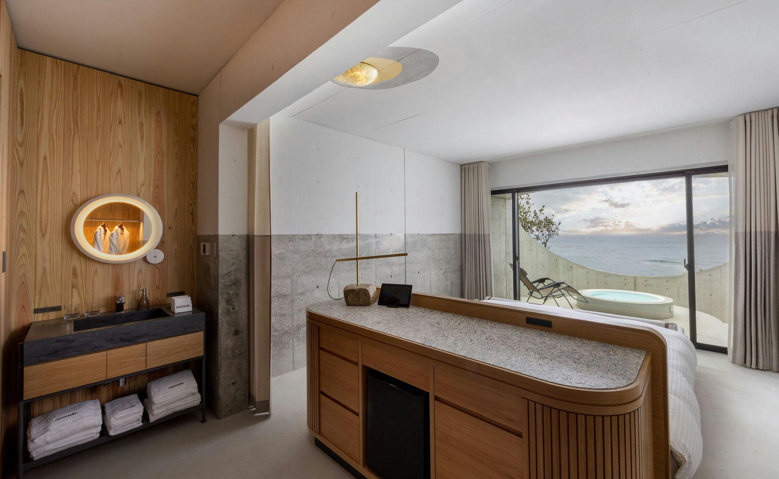 全室、壁一面の窓からオーシャンビュー、まるで自然と一体になったようなCAVE(洞窟)の中のゲストルームで静かな時間をお楽しみください。テラスからは遮る物のない水平線を一望でき、変わりゆく海と空の美しい眺望をお楽しみいただけるジャグジーを設置。