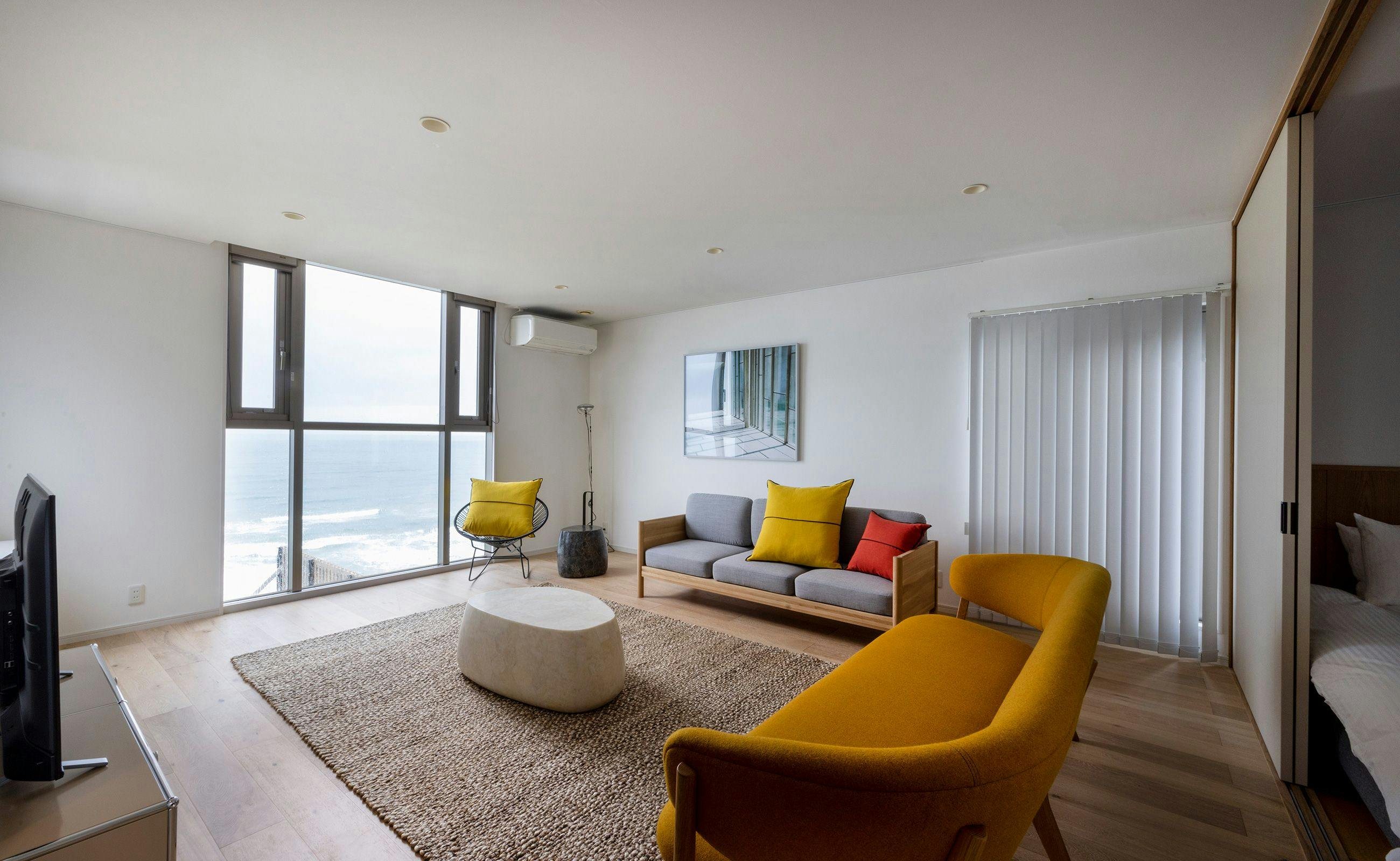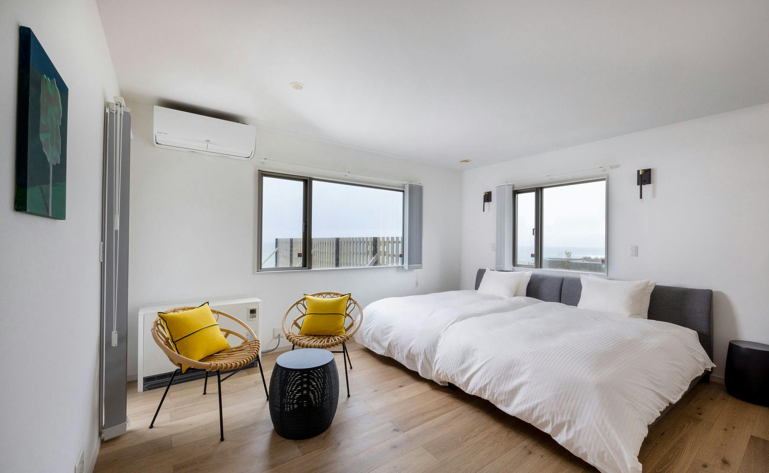 1Fには、オーシャンビューの洋室ベッドルーム(セミダブルサイズベッド×2)、和室のベッドルーム(シングルサイズマットレス×3)、目前に日本海が広がるテラス。