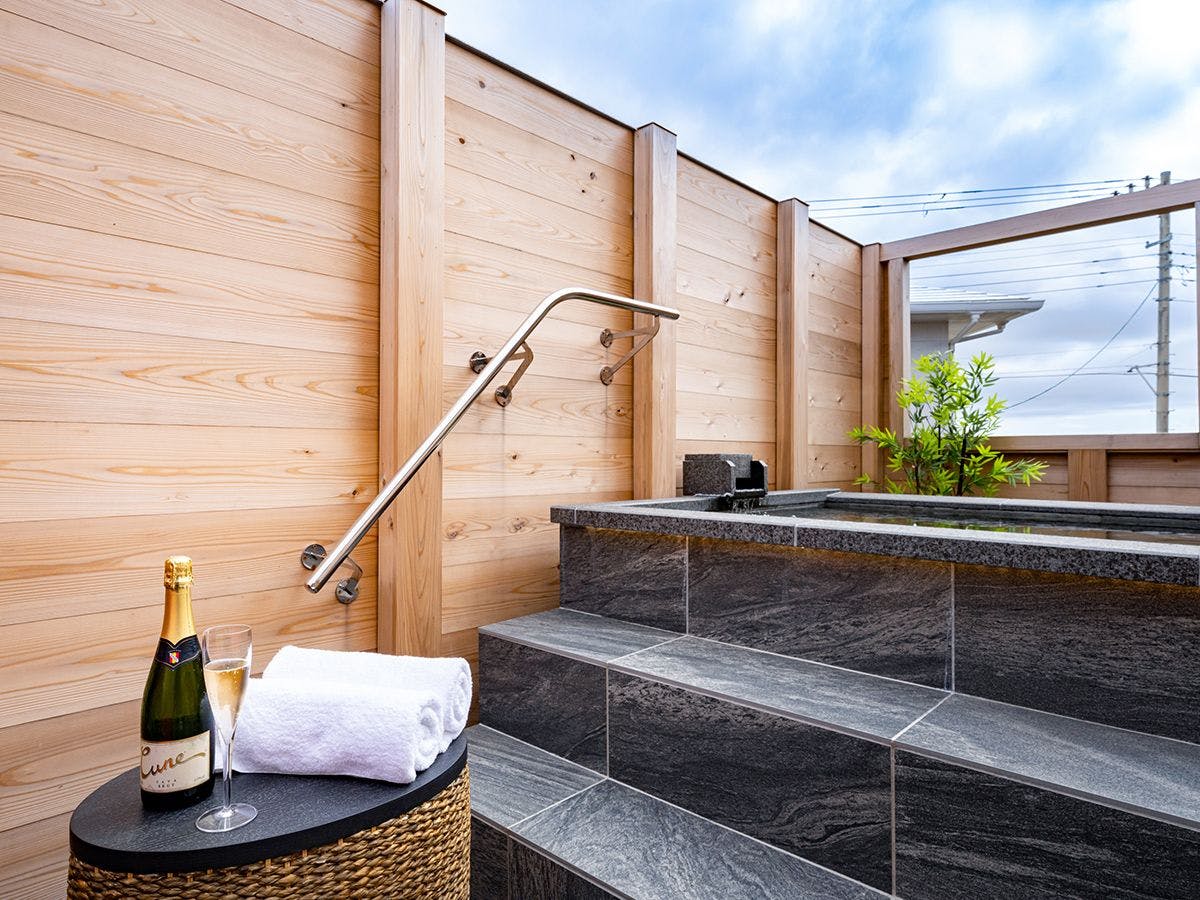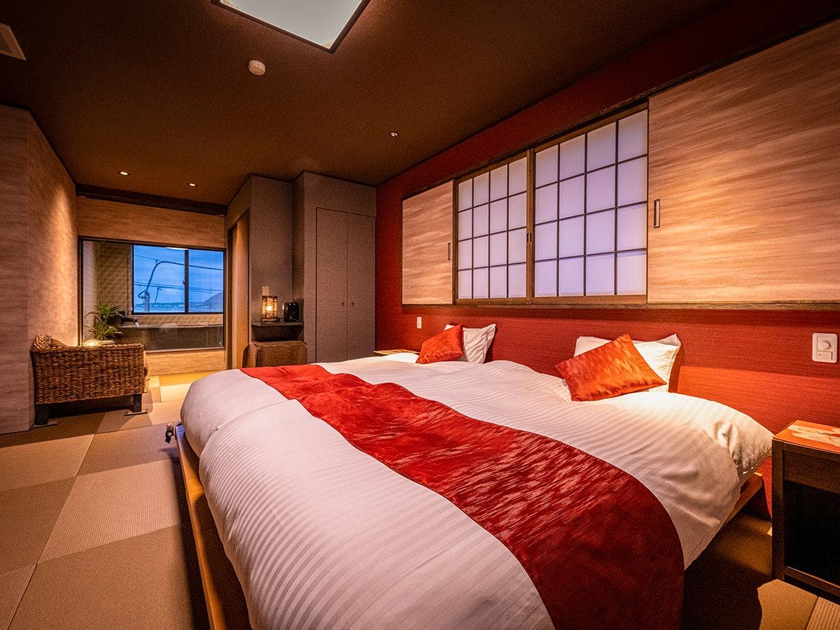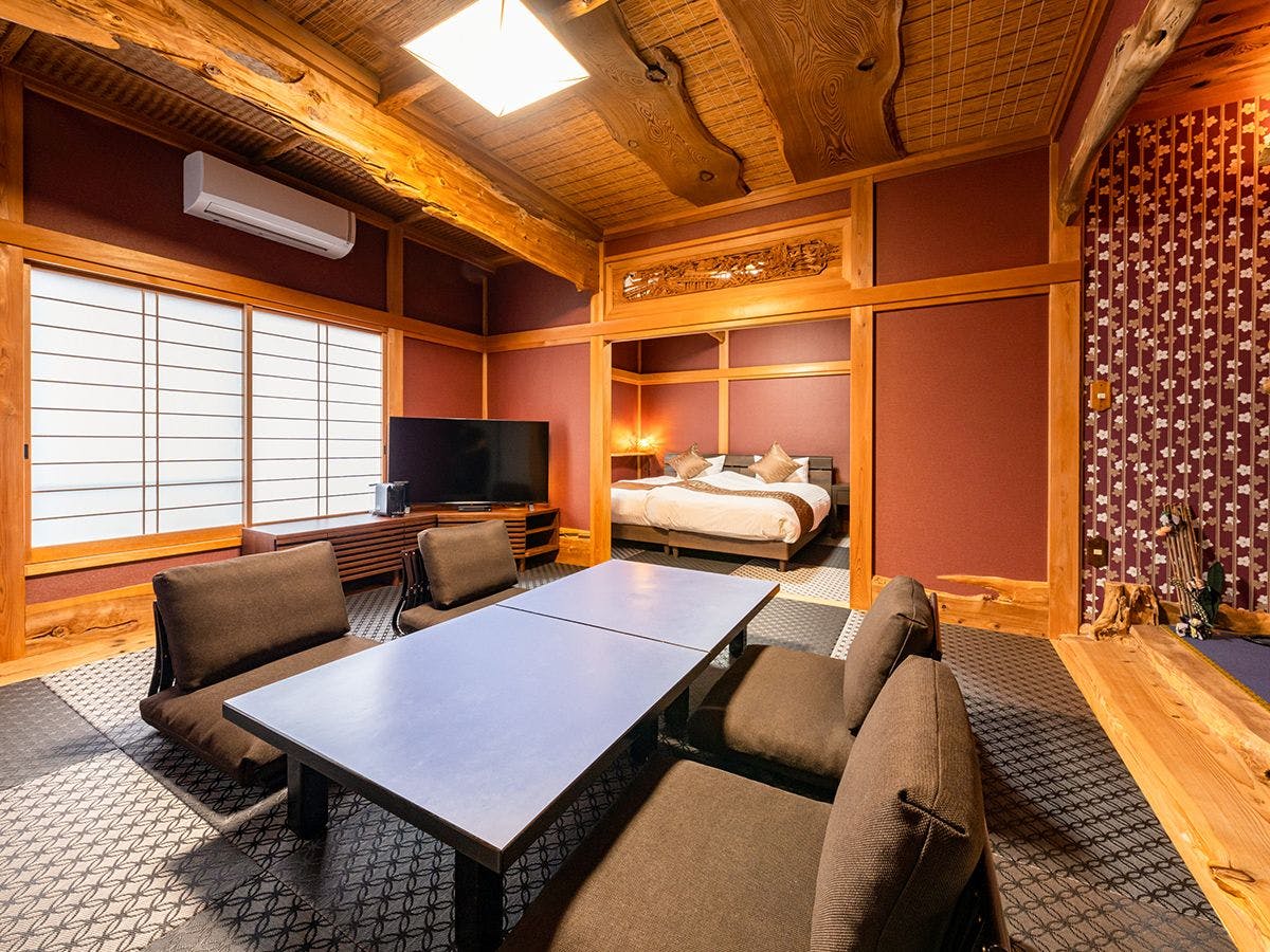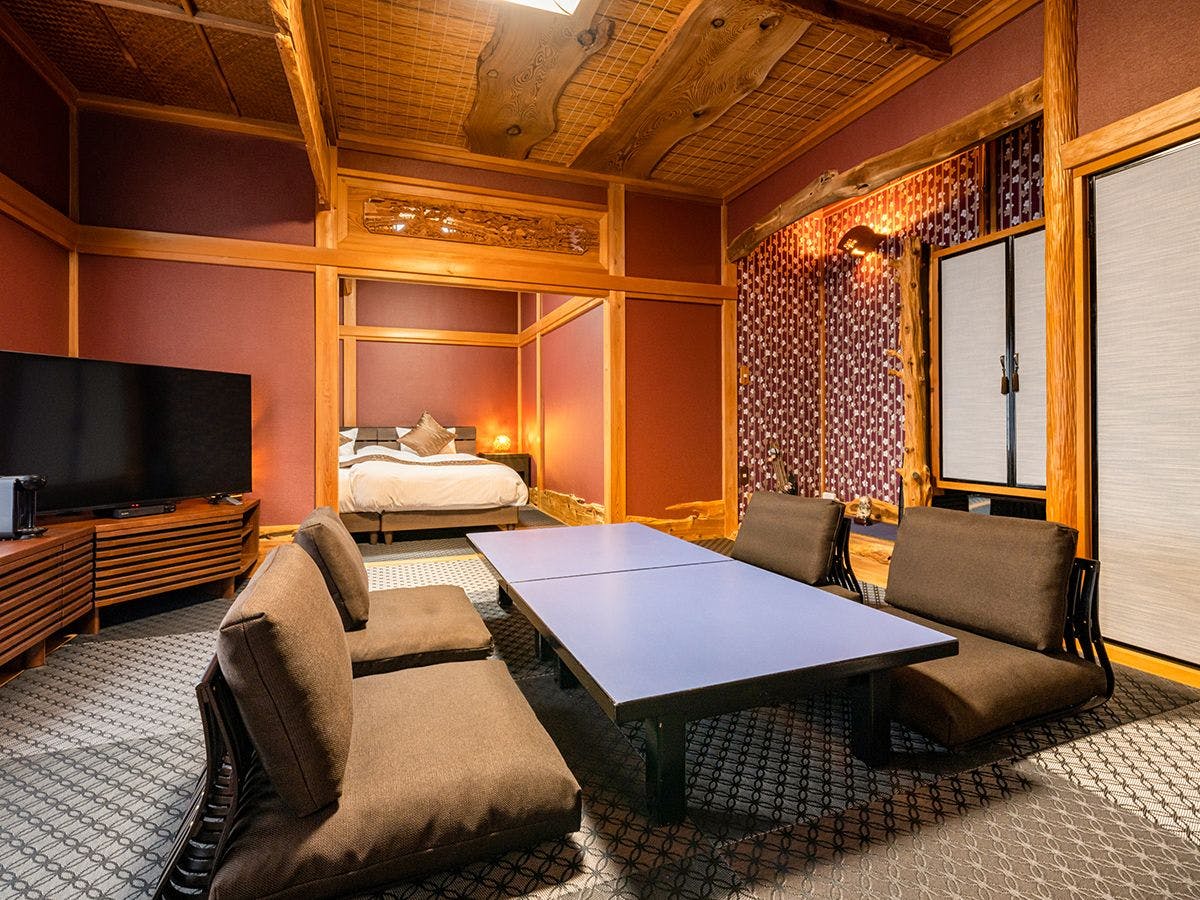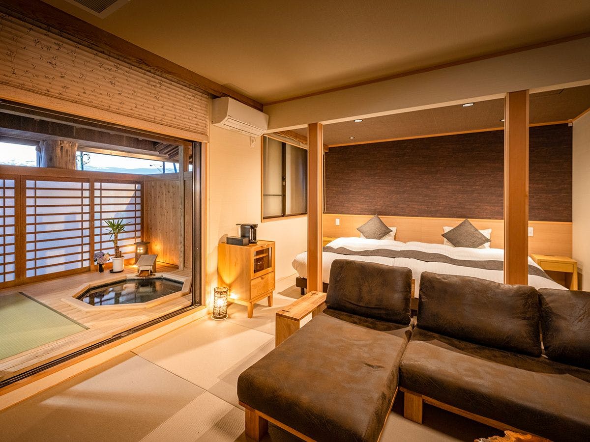 和洋室10畳+セミダブルベット2台+ダイニングルーム+露天風呂。5名様までお泊りいただけます。木の温もりが特徴の「八角形の露天風呂」付き。室内準バリアフリー対応。■全室禁煙、無料Wi-Fi■客室設備:テレビ、冷蔵庫、個別空調、湯沸かしポット、ドライヤー、金庫■アメニティ:タオル、バスタオル、歯みがきセット、カミソリ、くし・ぶらし、シャンプー・コンディショナー、ボディソープ、浴衣、くつろぎ着 等