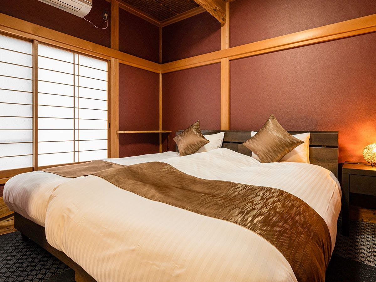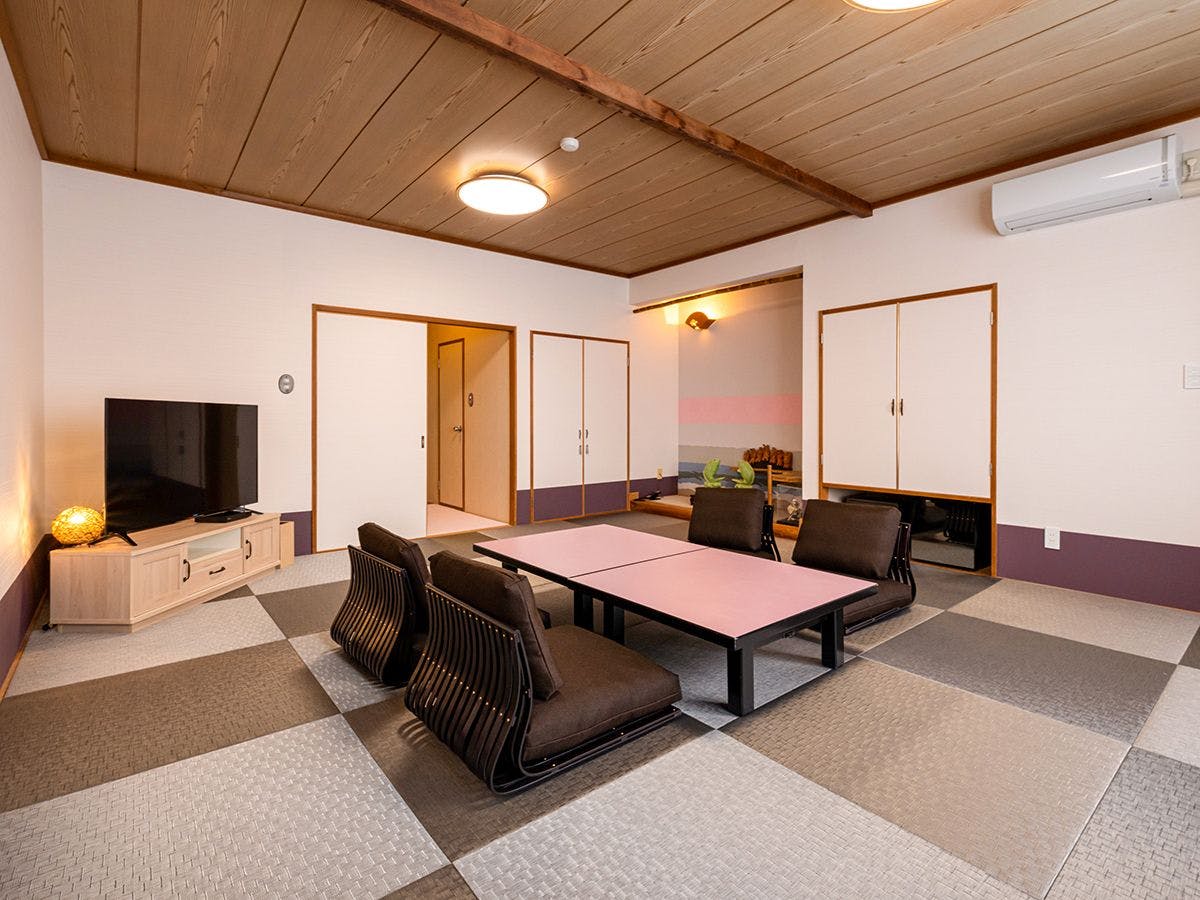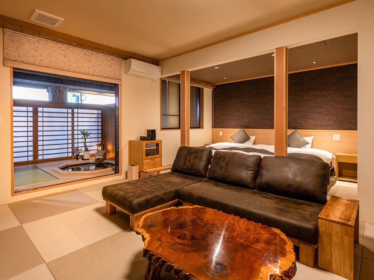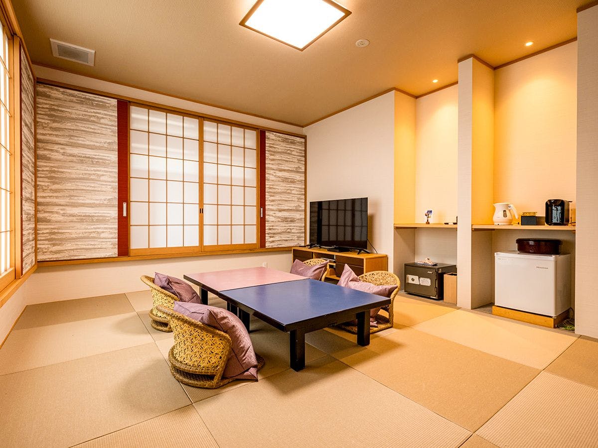 純和風の8畳間とコンパクトなベッドルーム。民家側にあるため、眺望はございませんがその分リーズナブルにお泊りいただけます。最高級ユニットバス「SYNLA」を設置■全室禁煙、無料Wi-Fi■客室設備:テレビ、冷蔵庫、個別空調、湯沸かしポット、ドライヤー、金庫■アメニティ:タオル、バスタオル、歯みがきセット、カミソリ、くし・ぶらし、シャンプー・コンディショナー、ボディソープ、浴衣、くつろぎ着 等
