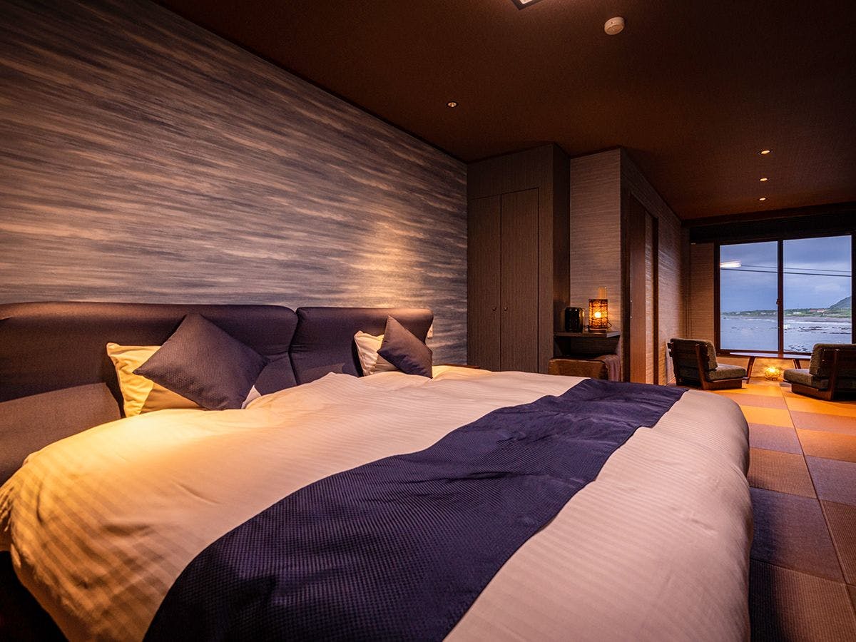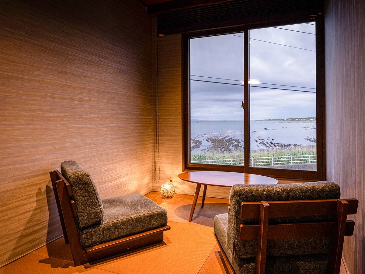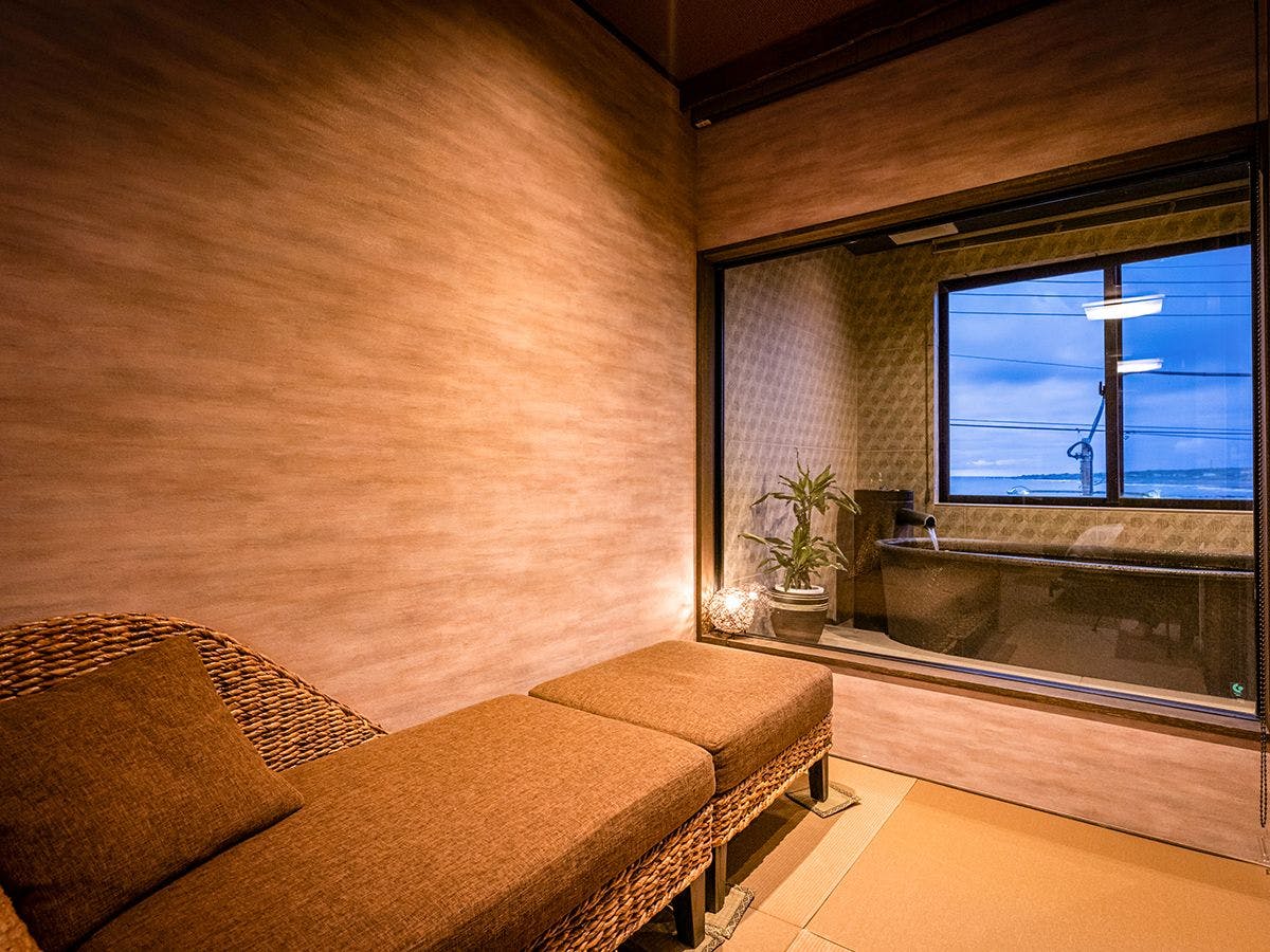 海の香りや夕焼け、星空を楽しめる展望露天風呂完備。手足を伸ばして寛げる畳のお部屋です。※海は露天風呂からのみご覧いただけます。お部屋からの眺望はございません。■全室禁煙、無料Wi-Fi■客室設備:テレビ、冷蔵庫、個別空調、湯沸かしポット、ドライヤー、金庫■アメニティ:タオル、バスタオル、歯みがきセット、カミソリ、くし・ぶらし、シャンプー・コンディショナー、ボディソープ、浴衣、くつろぎ着 等