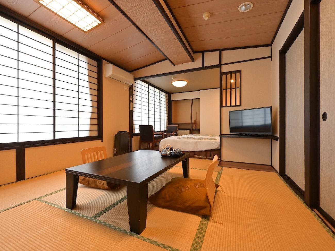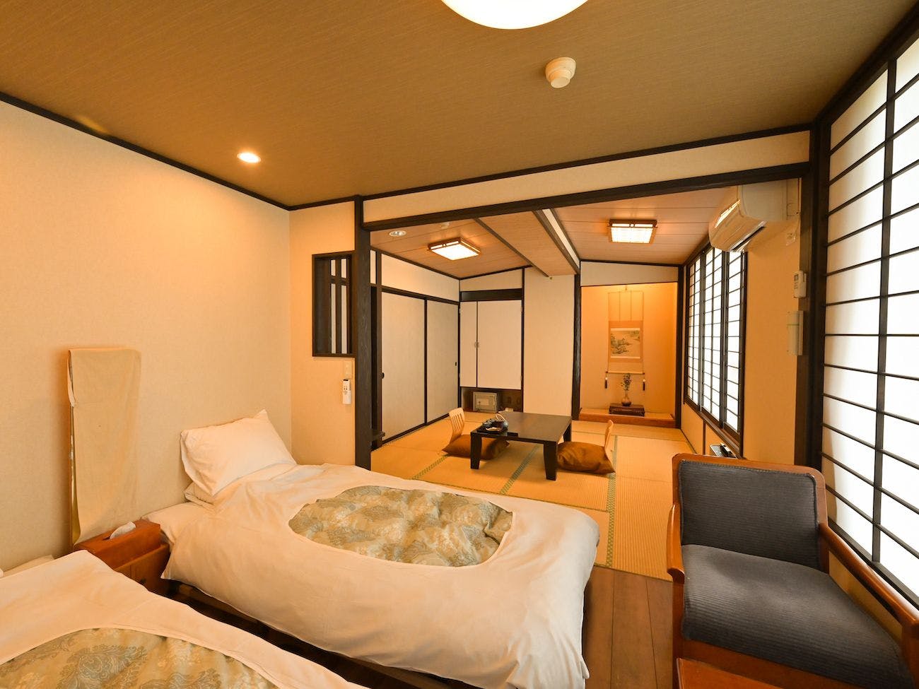 和モダンのエッセンスを取り入れた和室と、ツインベットを配置した客室です。