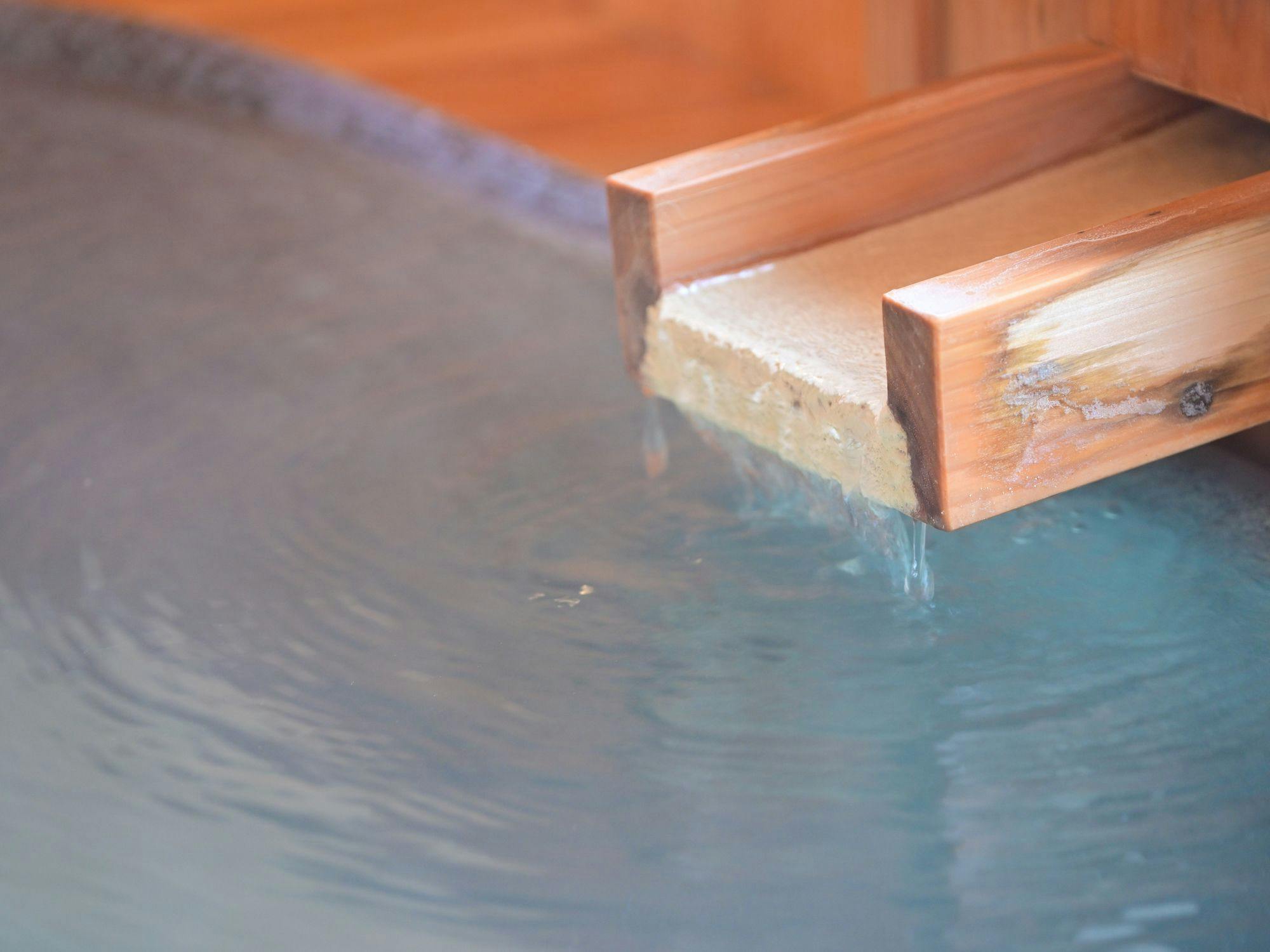 「当館の前で自噴する「地蔵の湯」源泉を、贅沢にも掛け流しのまま客室に引湯した、温泉内風呂付きの客室です。