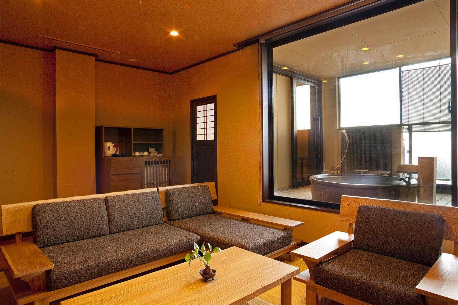 源泉掛け流しの露天風呂と独立したベッドルーム、緑あふれる庭園にかこまれたウッドテラス付いた湯宿一番地で1部屋だけの最上級のスイートです。