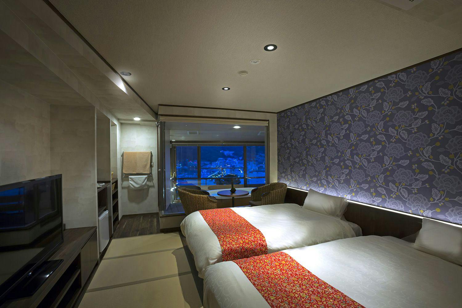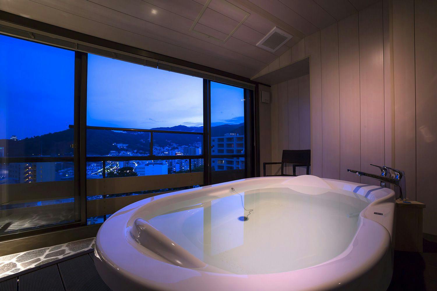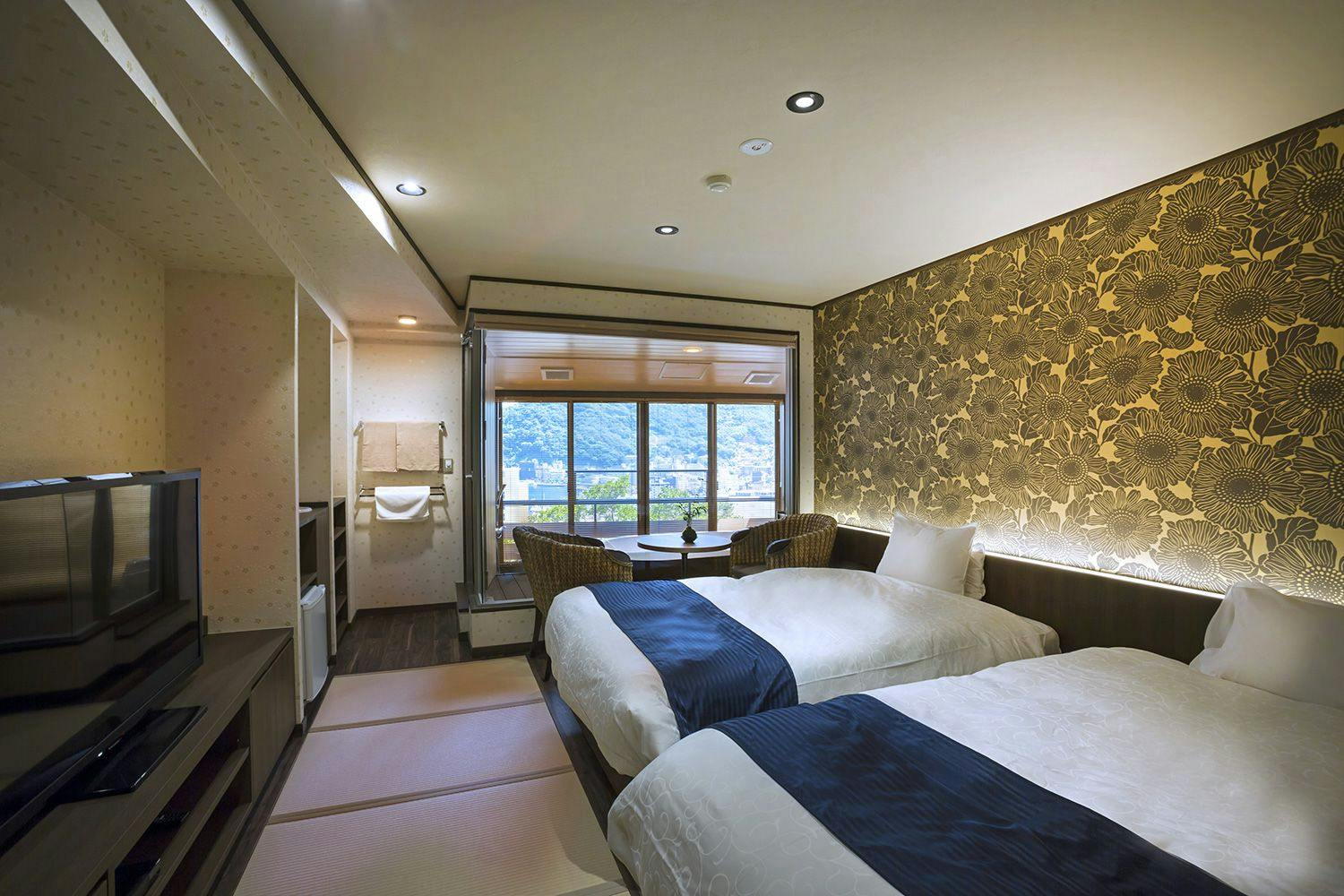 熱海の街並みを望む展望温泉風呂付きハリウッドツインルーム。