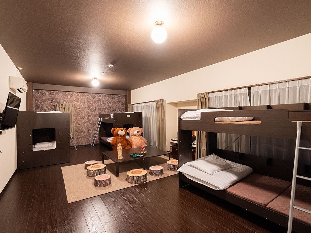 ファミリールームは、大人数でお安くお得にご宿泊頂くための価格にこだわったプランで眺望は望めません。寝具は二段ベット高反発マットでシーツ類はセルフサービスとなっております。素泊りのみのご案内となりますので、お食事やお飲物は必要分をお持ち込みください。お部屋での宴会、パーティー目的でのご利用は他のお客様に迷惑がかかりますのでご遠慮ください。