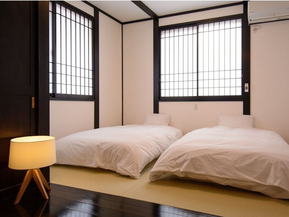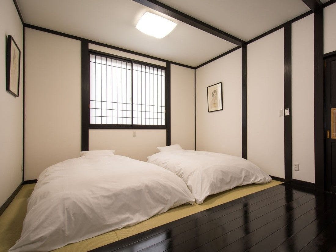お部屋は2つのシモンズ製ベッド+床に敷布団(3名利用時)となります。