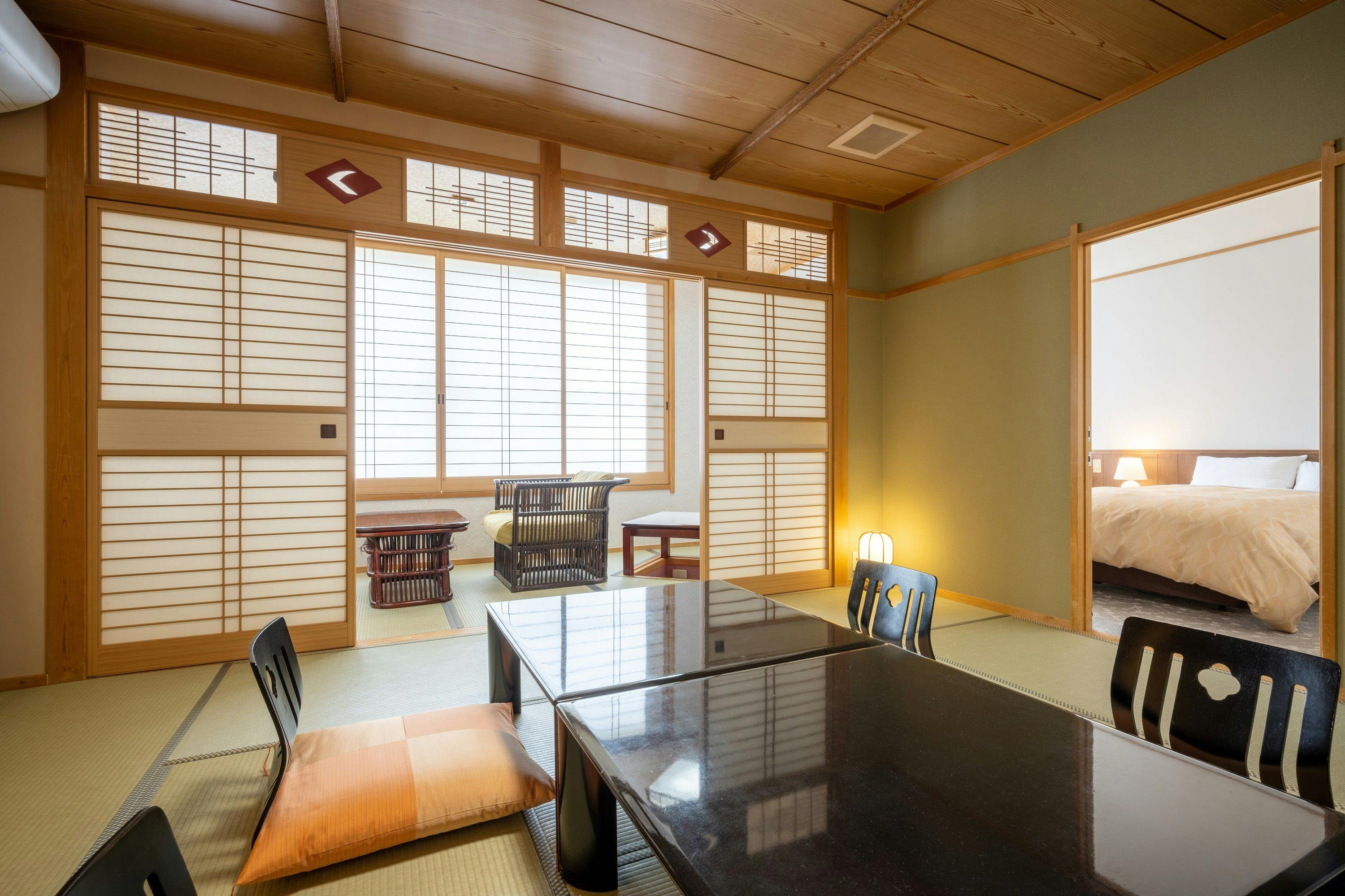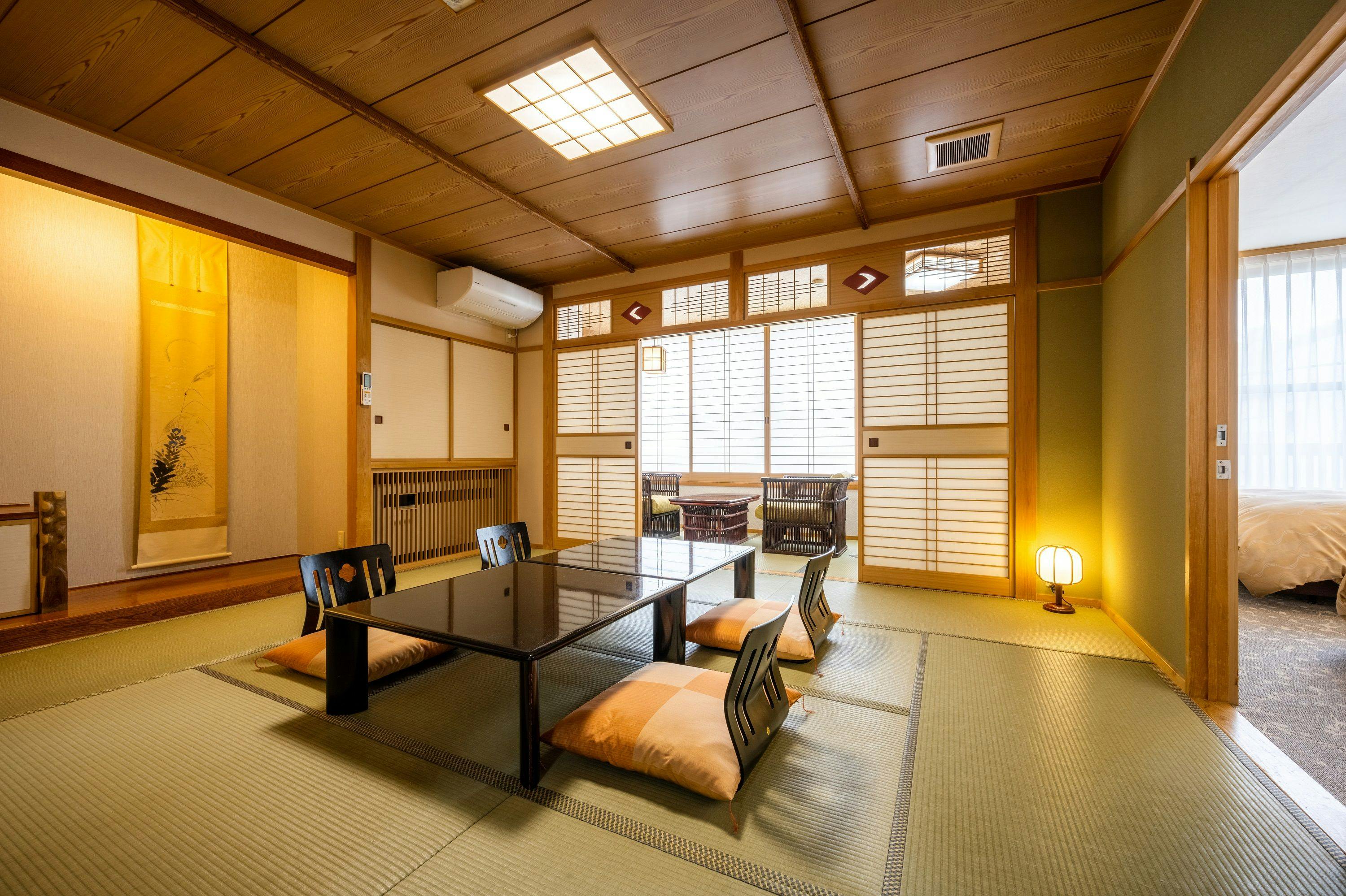 リピーターさんから指定の多い和洋室です。エレーベーターに近いので移動が少なく、年配の方にも優しい部屋タイプです。【和室10畳(約5.5畳の広縁付)+洋室(シモンズのツインベッド)】広縁には、籐椅子(2ケ)・テーブル・掘りごたつがあります。部屋に入ってすぐに和室と洋室に分かれるタイプと、和室を通って洋室に入る2つのタイプがあります。部屋の位置は温泉街に面しています。【備品】バス・トイレ(ウォッシュレット)・冷暖房・冷蔵庫・金庫・電話・ドライヤー・TV2台・浴衣・足袋・アメニティセット(タオル・歯ブラシ・くし他)・温水ポット