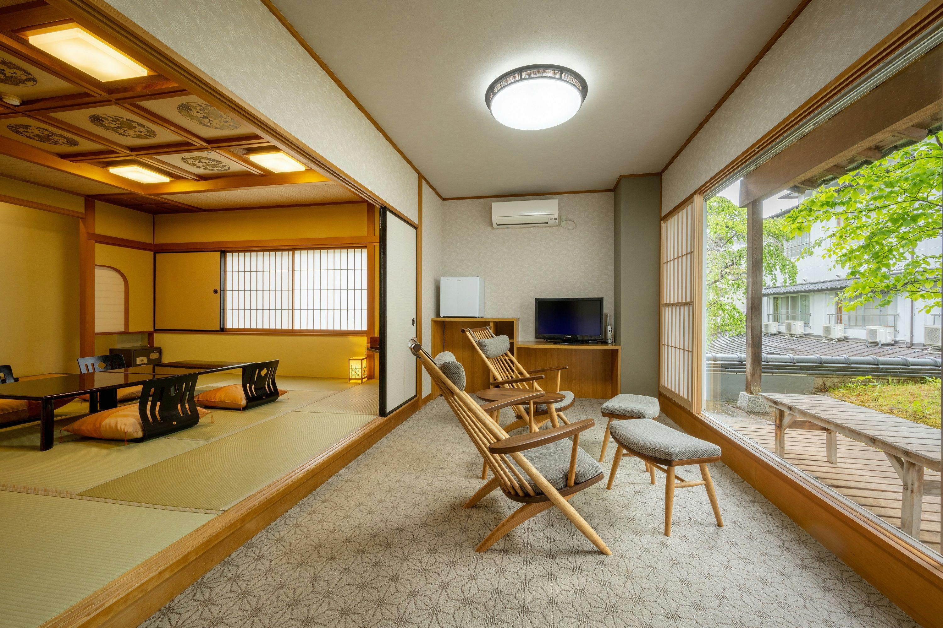 和室+リビングルーム+ベッドルーム(シモンズのツイン)で、6名定員のゆったりと過ごせるお部屋です。お部屋には専用の坪庭がついています。