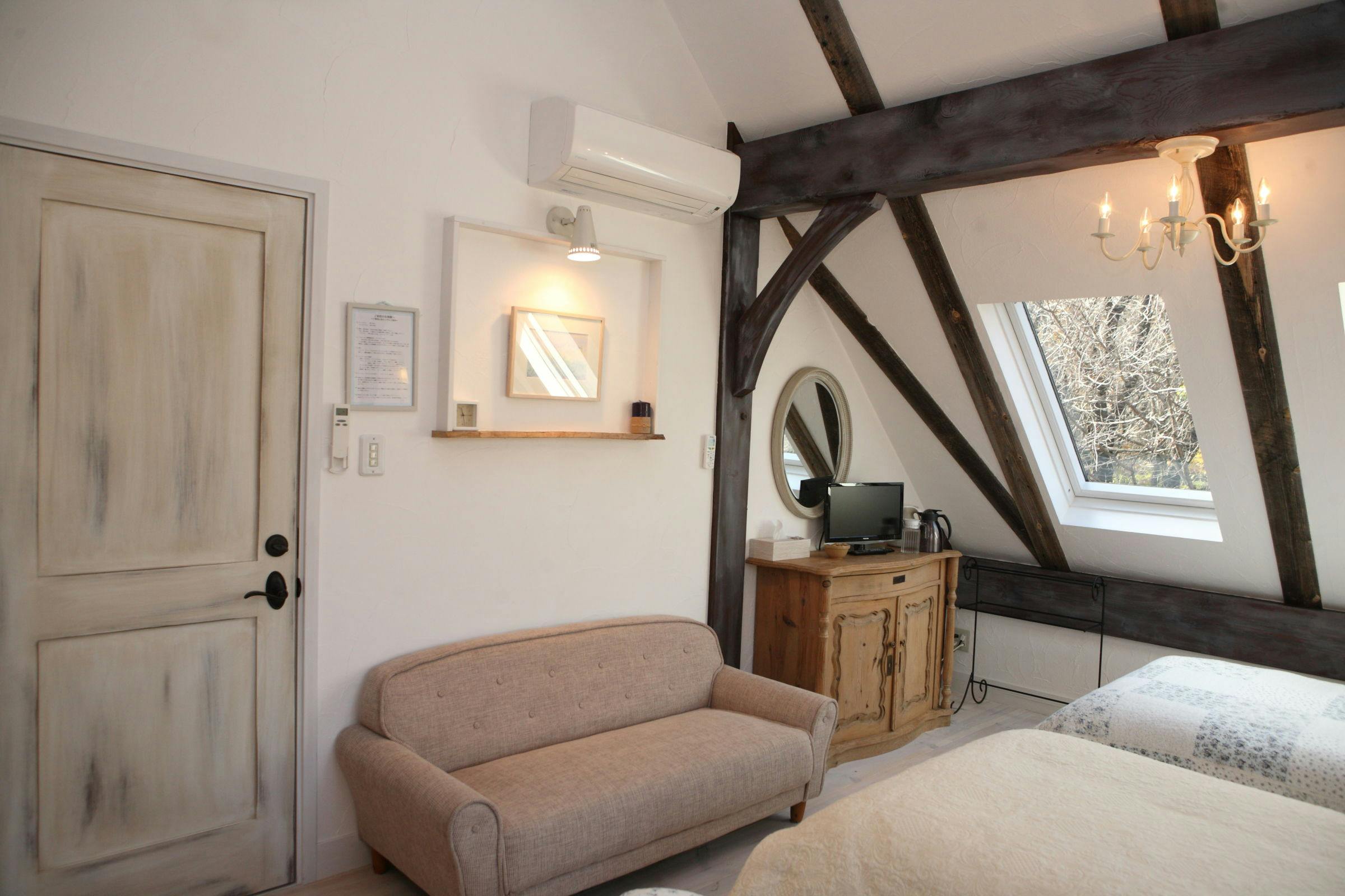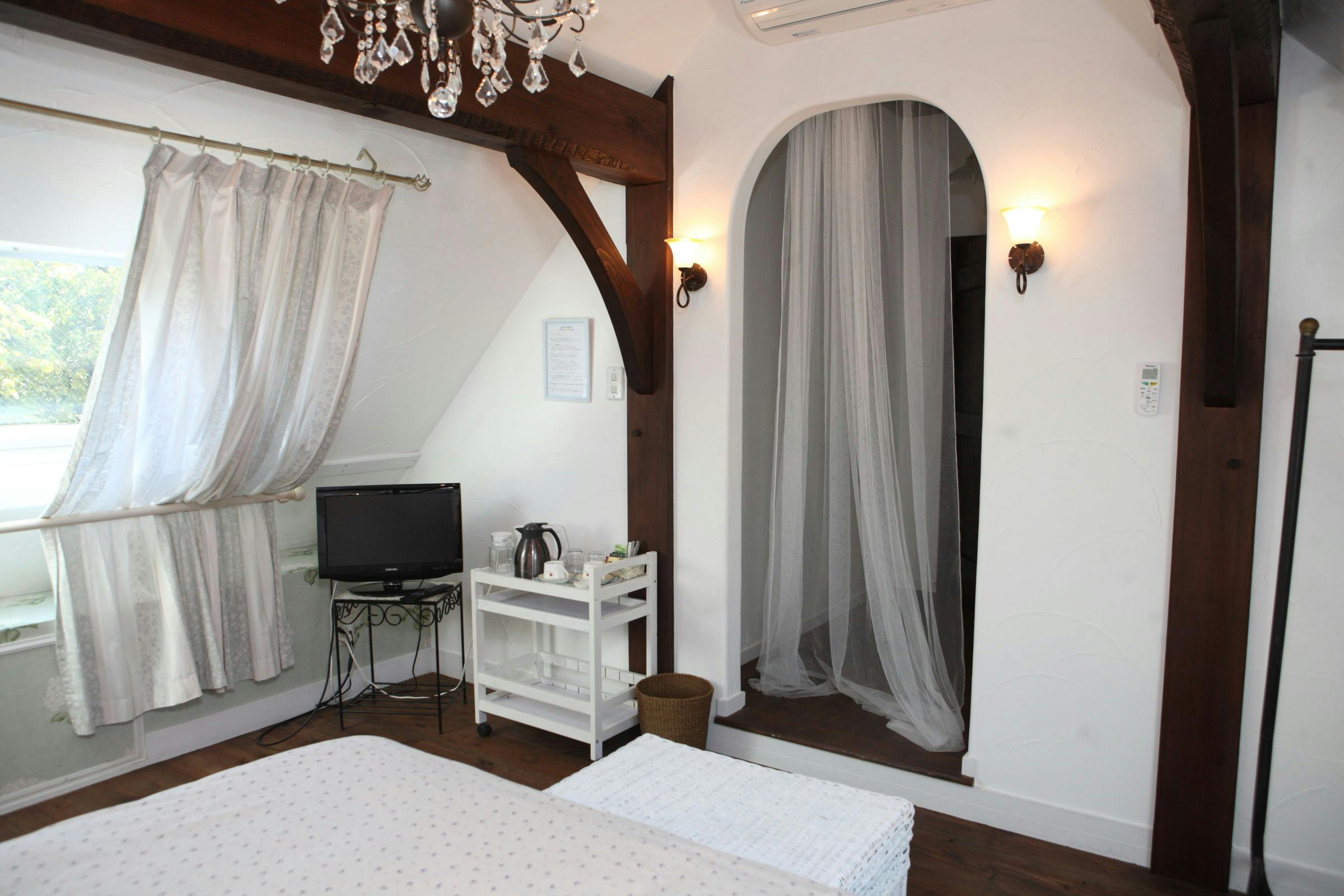 <シックなツインルーム>カップル・ご夫婦・お友達同士におすすめフレンチウィンドウ(観音開きの窓)からは、庭と遠くに牧草地が望めます。当館唯一、内窓もあるシックなお部屋です。