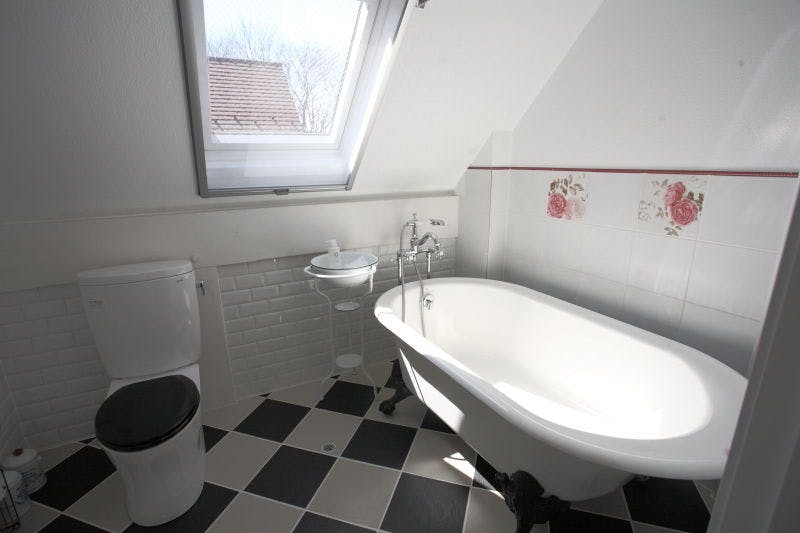<クイーンサイズのベッドと猫足洋バスのお部屋>カップル・ご夫婦におすすめ左右両側に、幅広の天窓がついている屋根裏部屋風のお部屋です。ベッドは、たっぷりめのクイーンサイズです。天窓付のバスルームには、猫足の洋バスとお洒落な洗面台があります。お二人の大切な時間をごゆっくりとお過ごしください。
