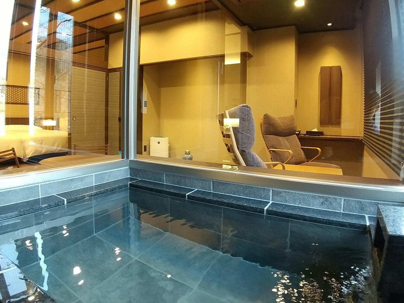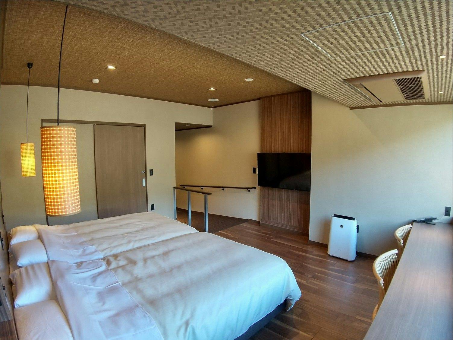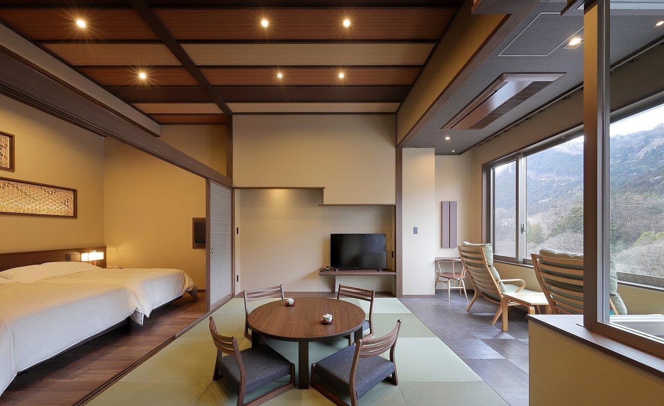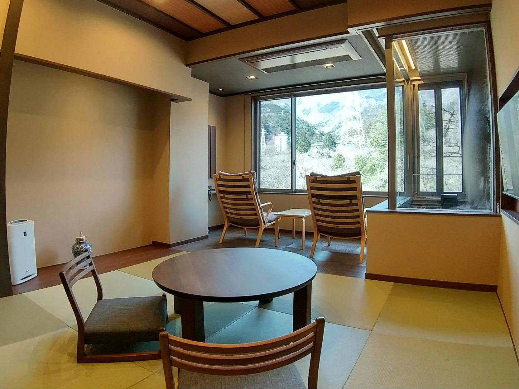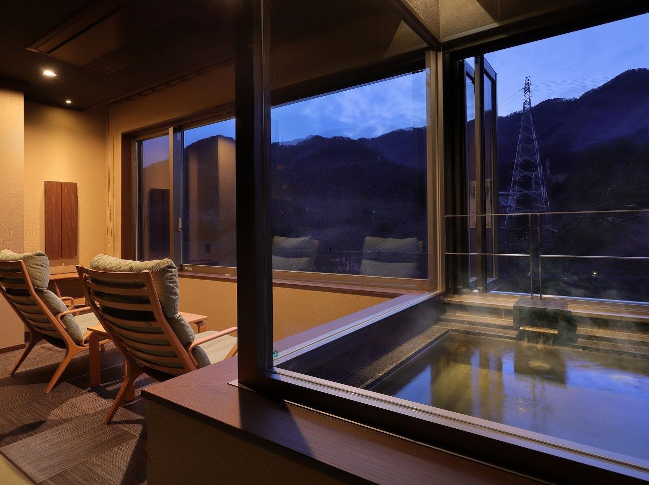 2022年2月にリニューアルしたばかりの温泉内風呂付き客室。高天井で大きな窓のお部屋では鬼怒川の渓谷美と山並みを一望できる。また、お部屋の内風呂からも絶景を愛でながら湯浴みが出来、好きな時にいつでも温泉三昧。和室は琉球畳を使用し50インチのテレビが設置してある。洋寝室は鹿沼組子のベットヘッド、32インチのテレビが設置してあります。お部屋は【禁煙ルーム】です。