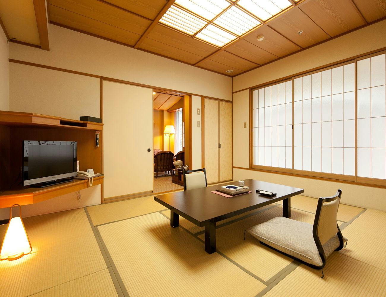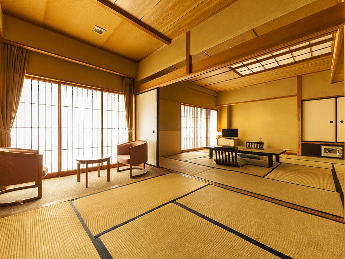 洋室にはツインベッド、応接セットのあるリビング、広々とした15畳本間、6畳副室と計4室の大人数でもゆったり過ごせるスイートタイプの客室で、三世代で還暦祝いや、2家族のグループ旅行など用途はお客様次第です。