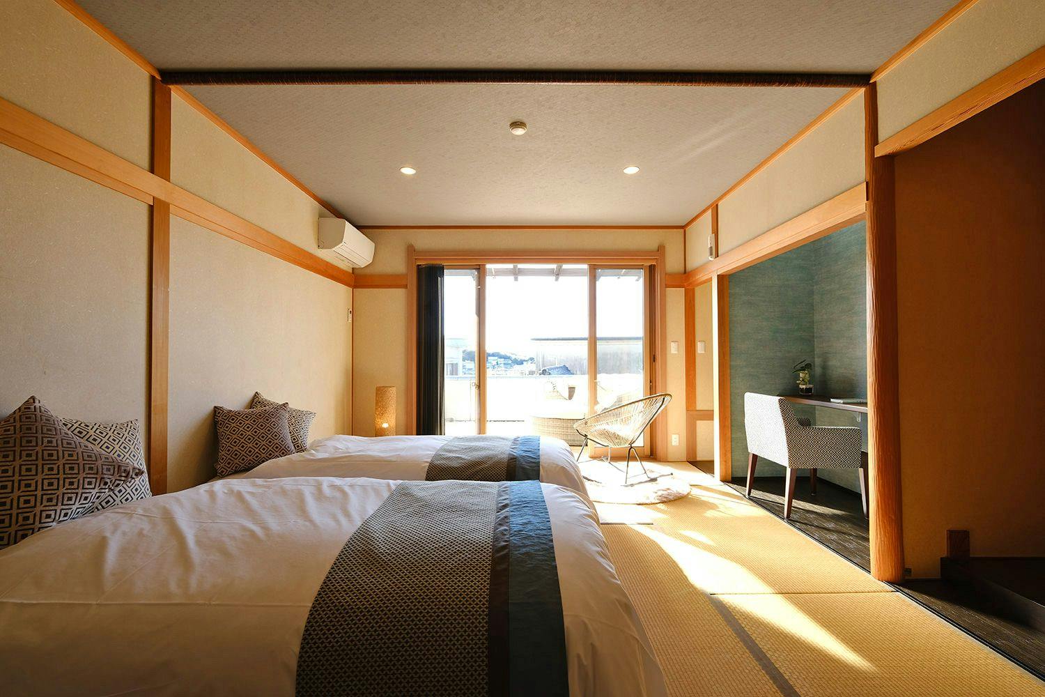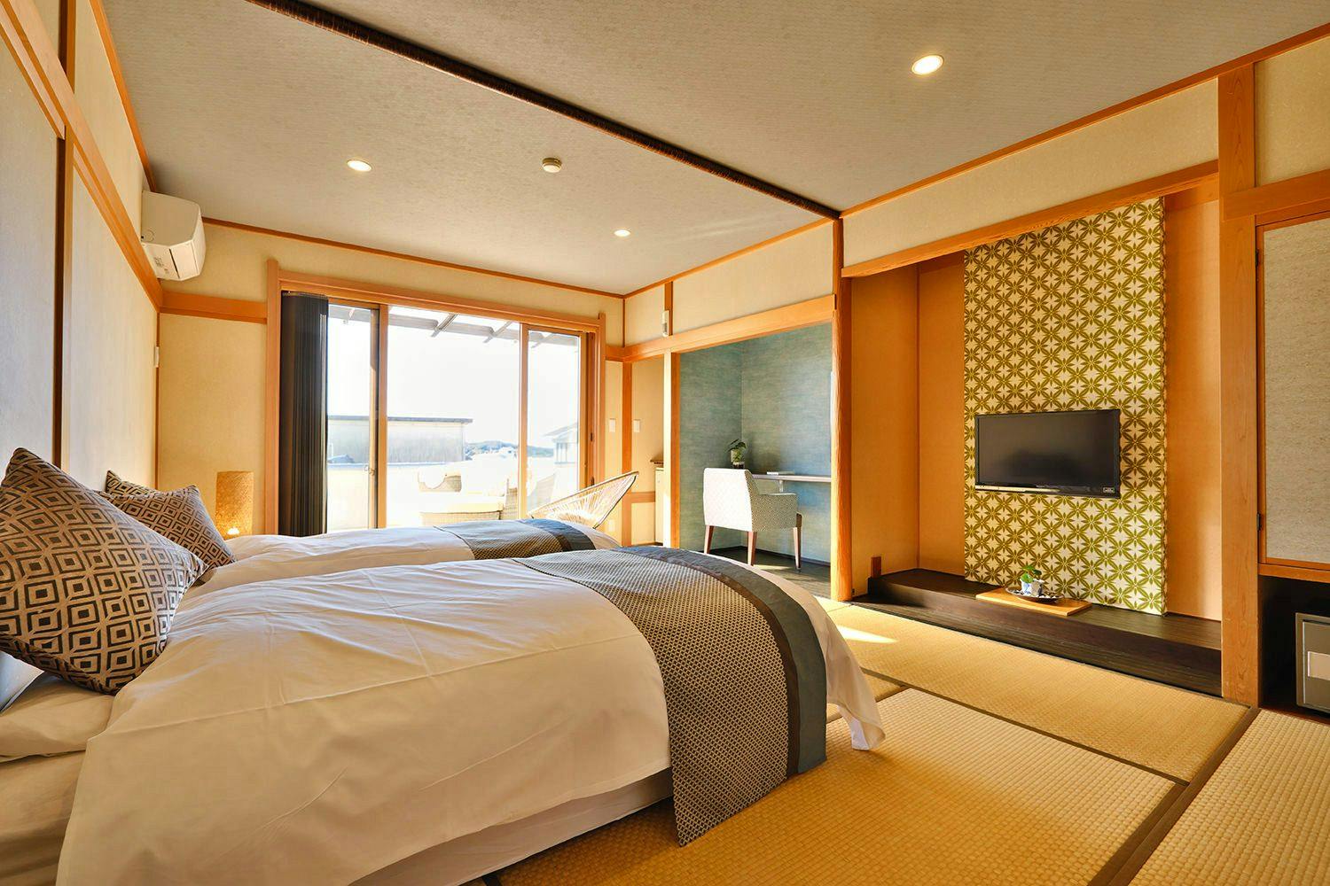 ゆっくり寛いでいただる畳の小上がりと、ツインのベッドルームが一続きとなるラグジュアリーな和モダン特別室です。広々としたシャワールームから繋がる専用の半露天風呂には、肌に優しい社宮司温泉の湯を注いでおります。