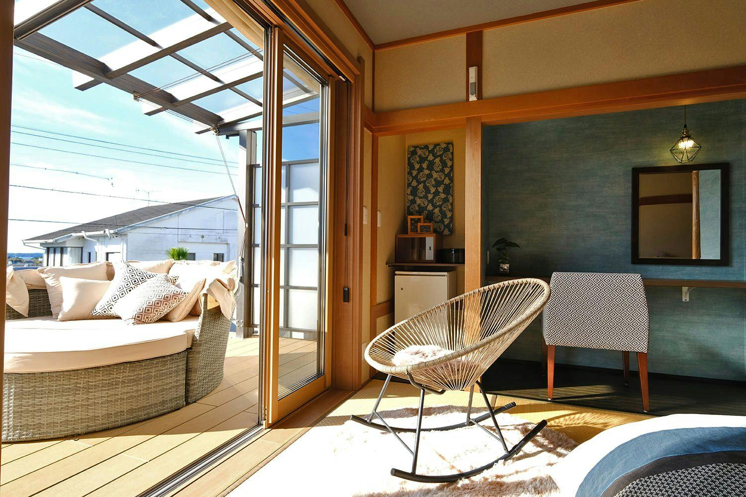 湯上りに涼んでいただける開放的なウッドテラスに、ゆっくりと身支度していただけるパウダールーム。こちらは完全バリアフリーに対応したお部屋で、どなたにでも安心・快適にお泊まりいただけます。ご家族ご友人との素敵な時間をお過ごしください。