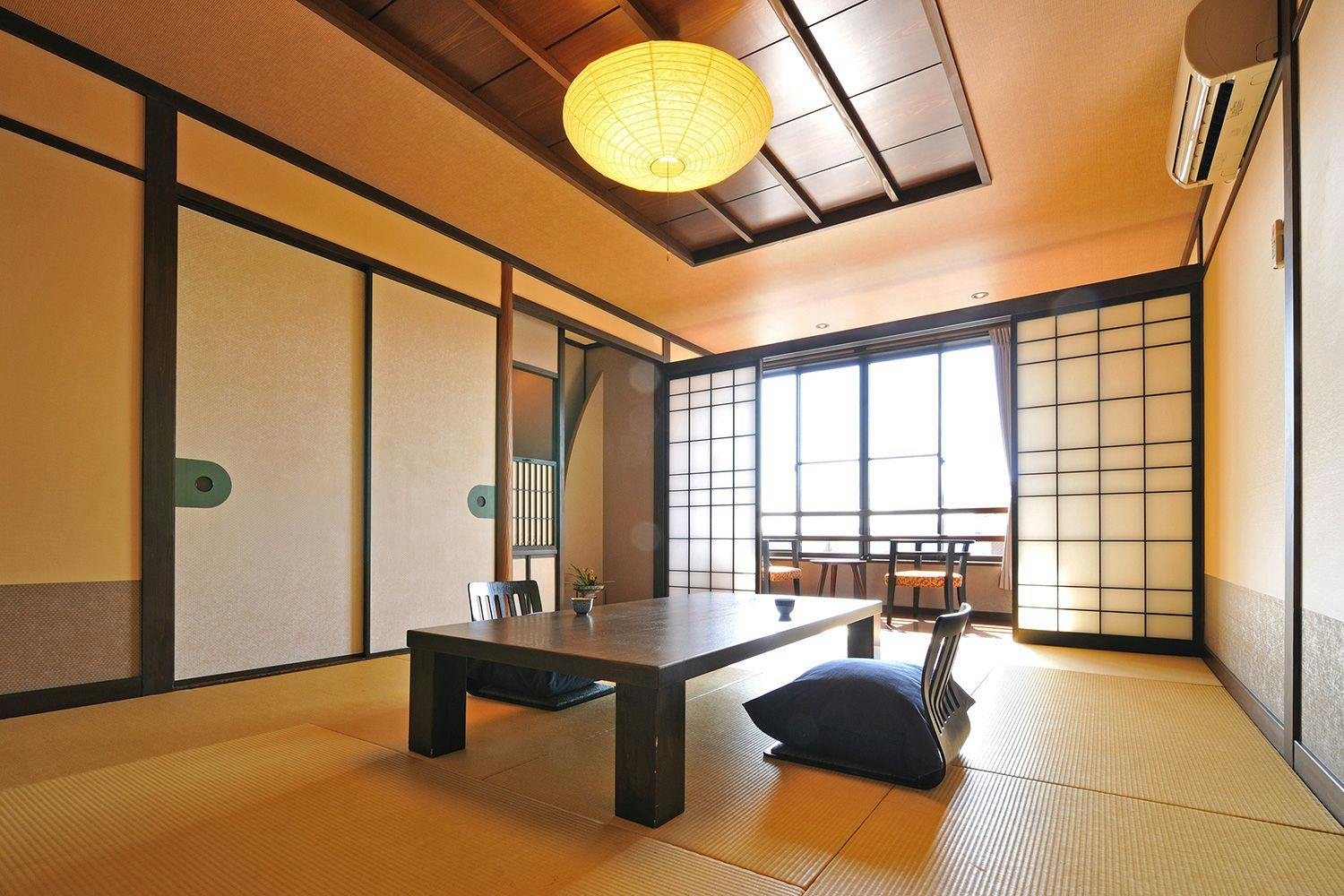 ゆっくり寛いでいただる畳の小上がりと、ツインのベッドルームが一続きとなるラグジュアリーな和モダン特別室です。広い脱衣場&バウダールームから繋がる専用の半露天風呂には、肌に優しい社宮司温泉の湯を注いでおります。