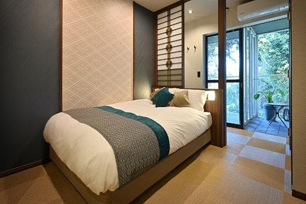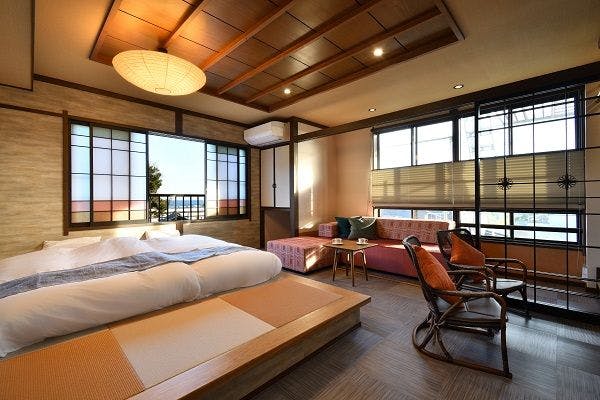 展望テラス+温泉露天風呂付きの客室を和モダンに設えました。ダブルベッドのあるスモールラグジュアリーを意識した特別室となります。お部屋についている露天風呂は、肌に優しい社宮司温泉の湯を注いでおります。