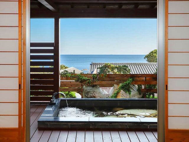太平洋を望む眺望の良い丘に5000坪の敷地を構えた1日9室だけの隠れ宿。2019年7月にリニューアルした全室オーシャンビュー露天風呂付12畳和室。名湯榊原温泉の湯と伊勢志摩の食をご堪能いただけます。
