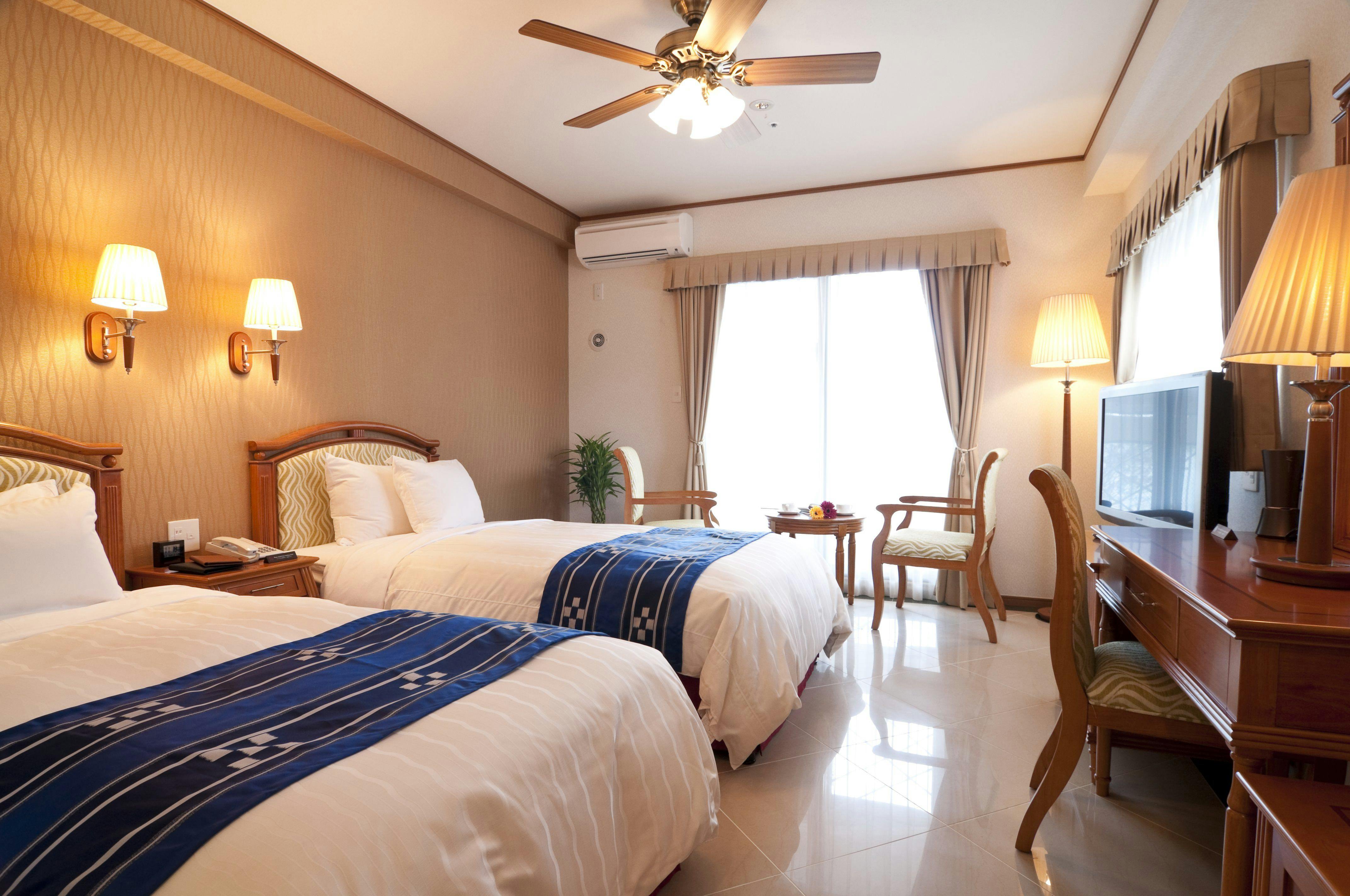 ホテル最上階の11階にエグゼグティブルーム1名様から3名様のご利用が可能な30平米のツインルーム。お部屋から眺める景色は、サンゴ礁煌めく沖縄の海が水平線まで見渡せる絶景!お部屋は木(ウッド)調のインテリアで落ち着いた癒し空間です。広めのバスルームは、こだわりの洗面台と、バスタブをご用意。寛ぎのバスタイムをご満喫ください!