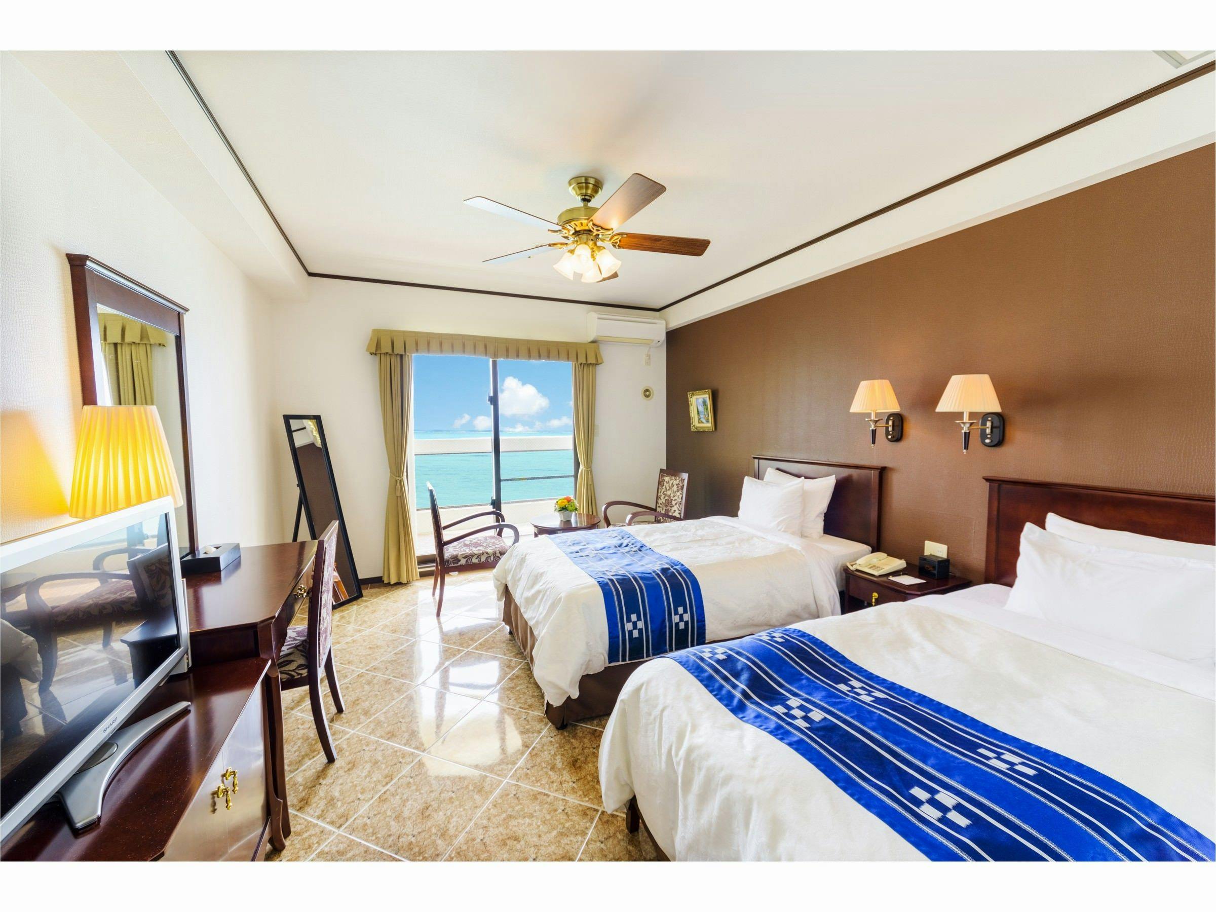 オーシャンビュー43平米プレミアムツインルーム。最大4名様までご宿泊いただけます。広いバルコニーから臨むエメラルドグリーンの海と雄大なサンセット、さらにソファ・センターテーブルを配置したゆとりある客室は非日常を味わうことのできる贅沢な空間です。夜は落ち着きのある照明が空間を静かに演出します。2ボウルの洗面台と大きな鏡のある広めの化粧室は、女性グループのご利用にも適しています。※階数のご指定はできませんので、予めご了承ください。