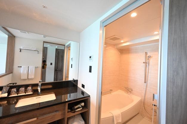 ホテル最上階の11階にエグゼグティブルームがOPEN!1名様から3名様のご利用が可能な30平米のツインルーム+約4平米のロフト付き。お部屋から眺める景色は、サンゴ礁煌めく沖縄の海が水平線まで見渡せる絶景!お部屋は木(ウッド)調のインテリアで落ち着いた癒し空間です。広めのバスルームは、こだわりの洗面台と、バスタブをご用意。寛ぎのバスタイムをご満喫ください!