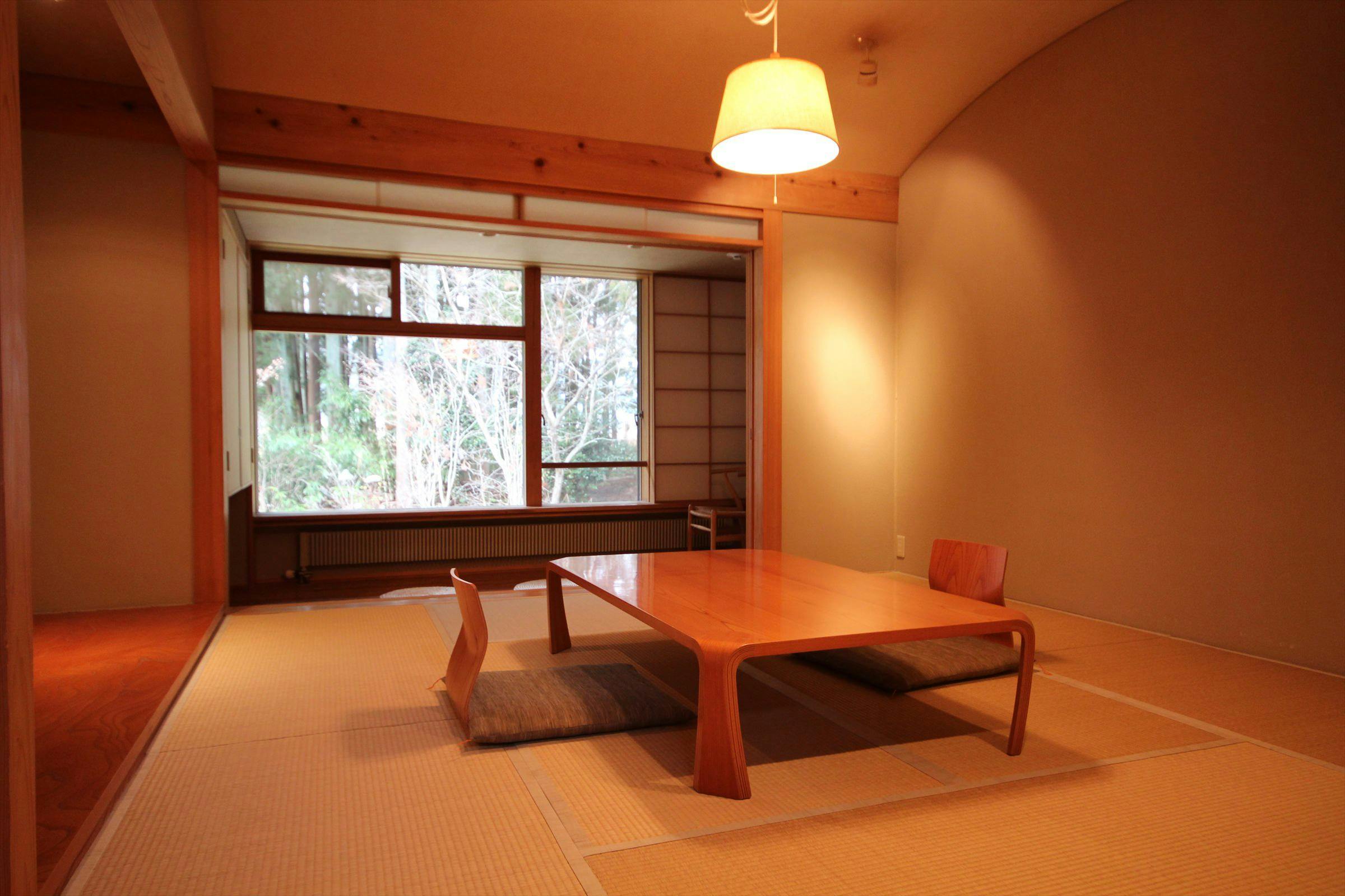 大きくとられた窓からは、5世紀頃に造られたとされる前方後方墳の石の梅古墳の杉木立が見えます。夜の静寂と闇の空間も貴重なものに感じていただけるのでは・・・。「金山杉」を使った和室タイプのお部屋です。お部屋全体を同系色でまとめ、外の森風景と一体化できるシンプルな造りです。木のいい香りの中、ゆったりとお過ごし下さい