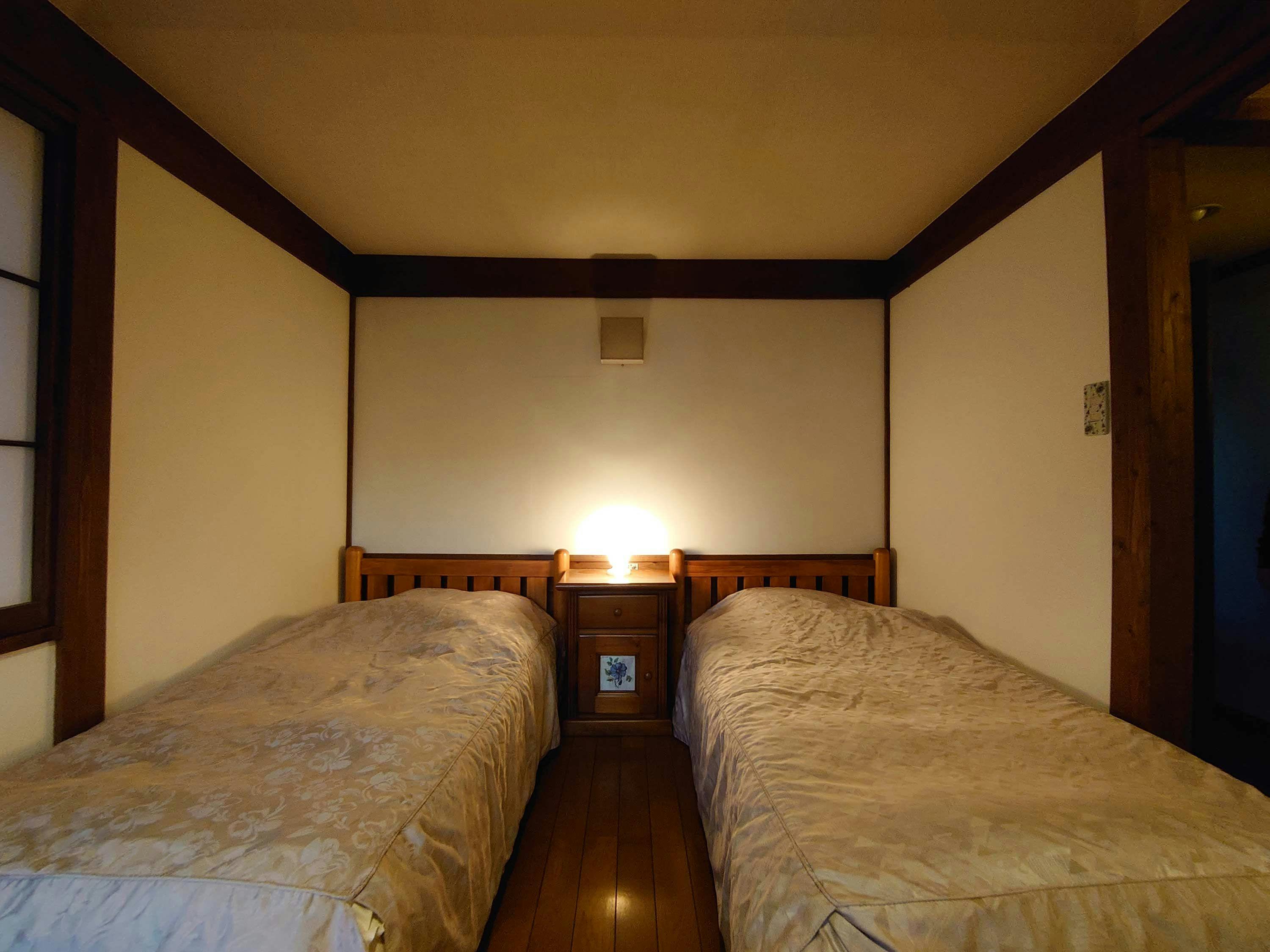 洋室(ツインベッド)のお部屋です。【設備・アメニティ】トイレ/洗面所/クローゼット/エアコン/電気ポット/お茶セット/ドライヤータオル/歯ブラシ/石けん/ヘアキャップ/ひげそり/浴衣/羽織/Wi-Fi利用可※客室にテレビ・冷蔵庫・バスルームはございません。