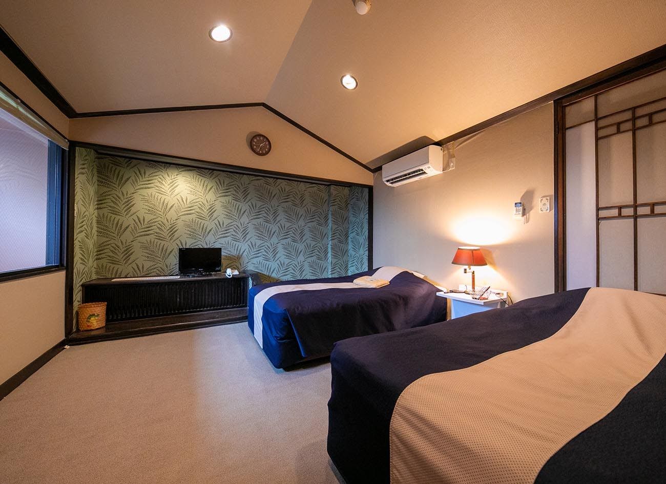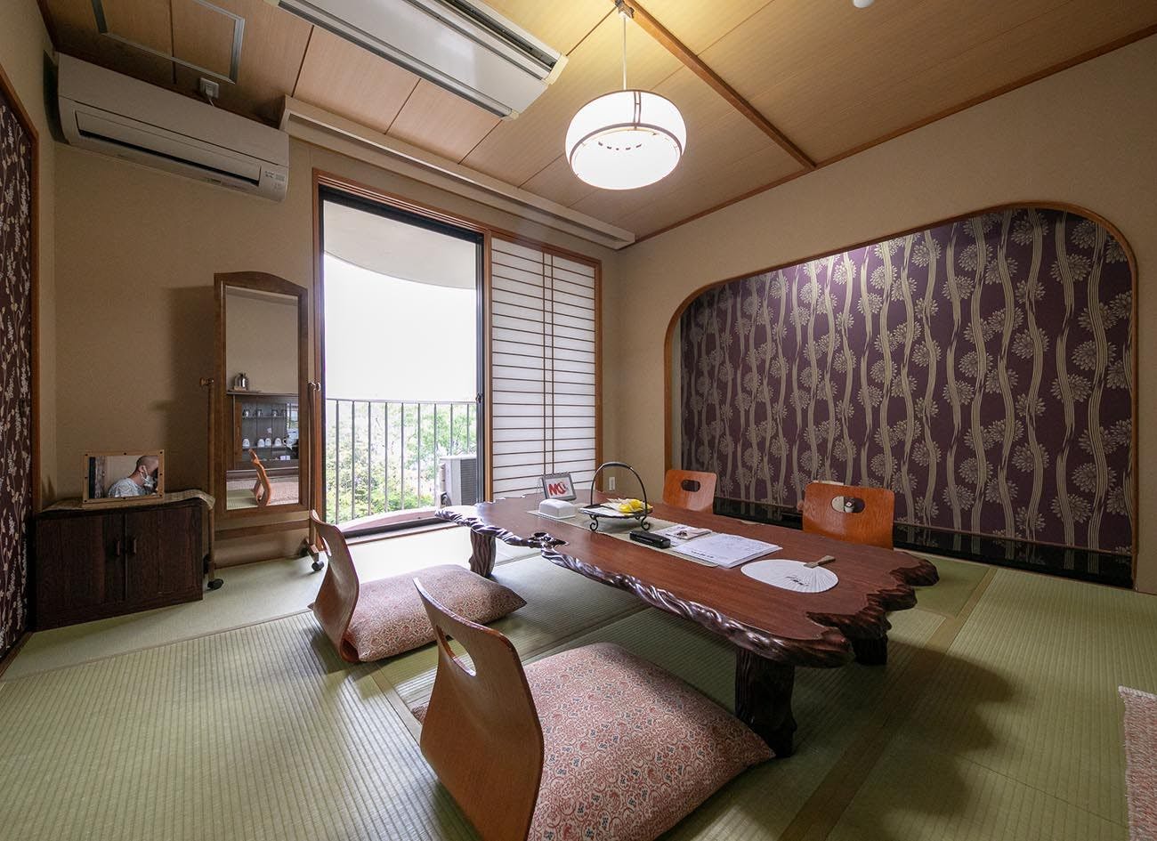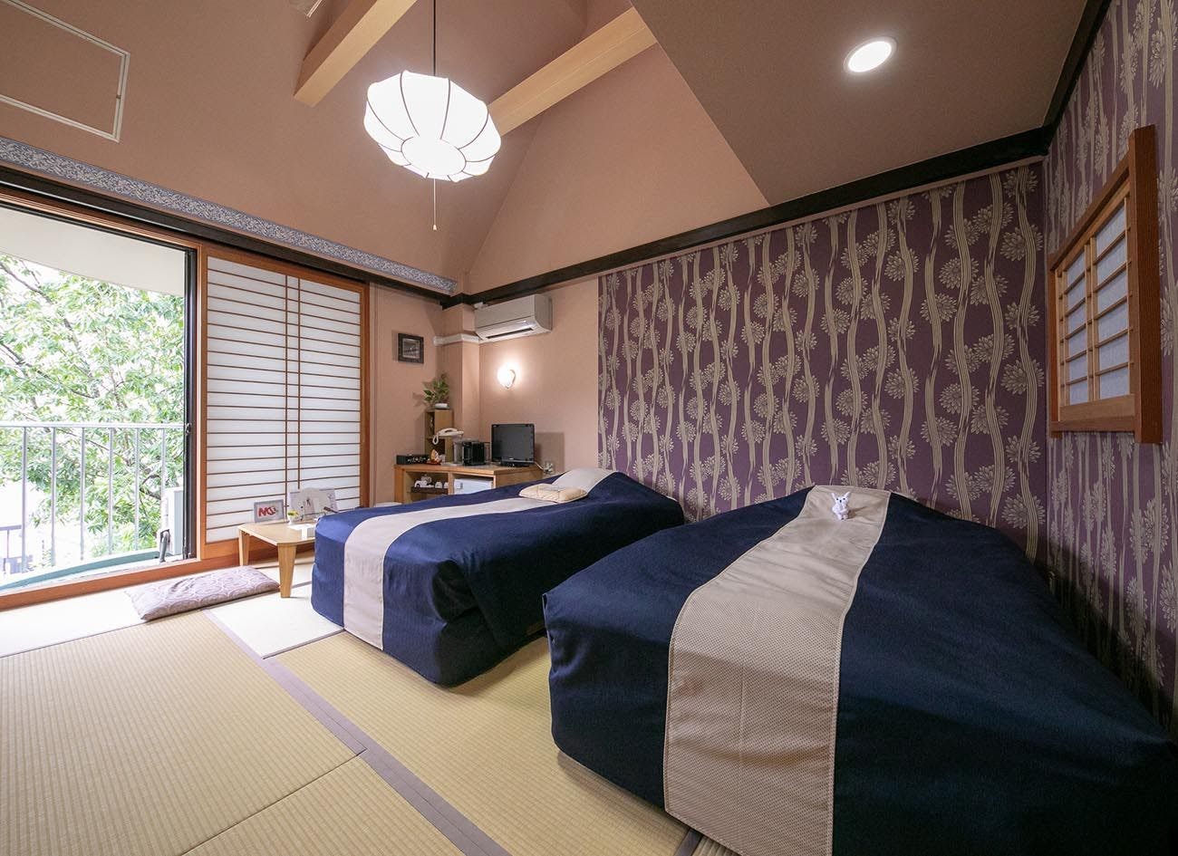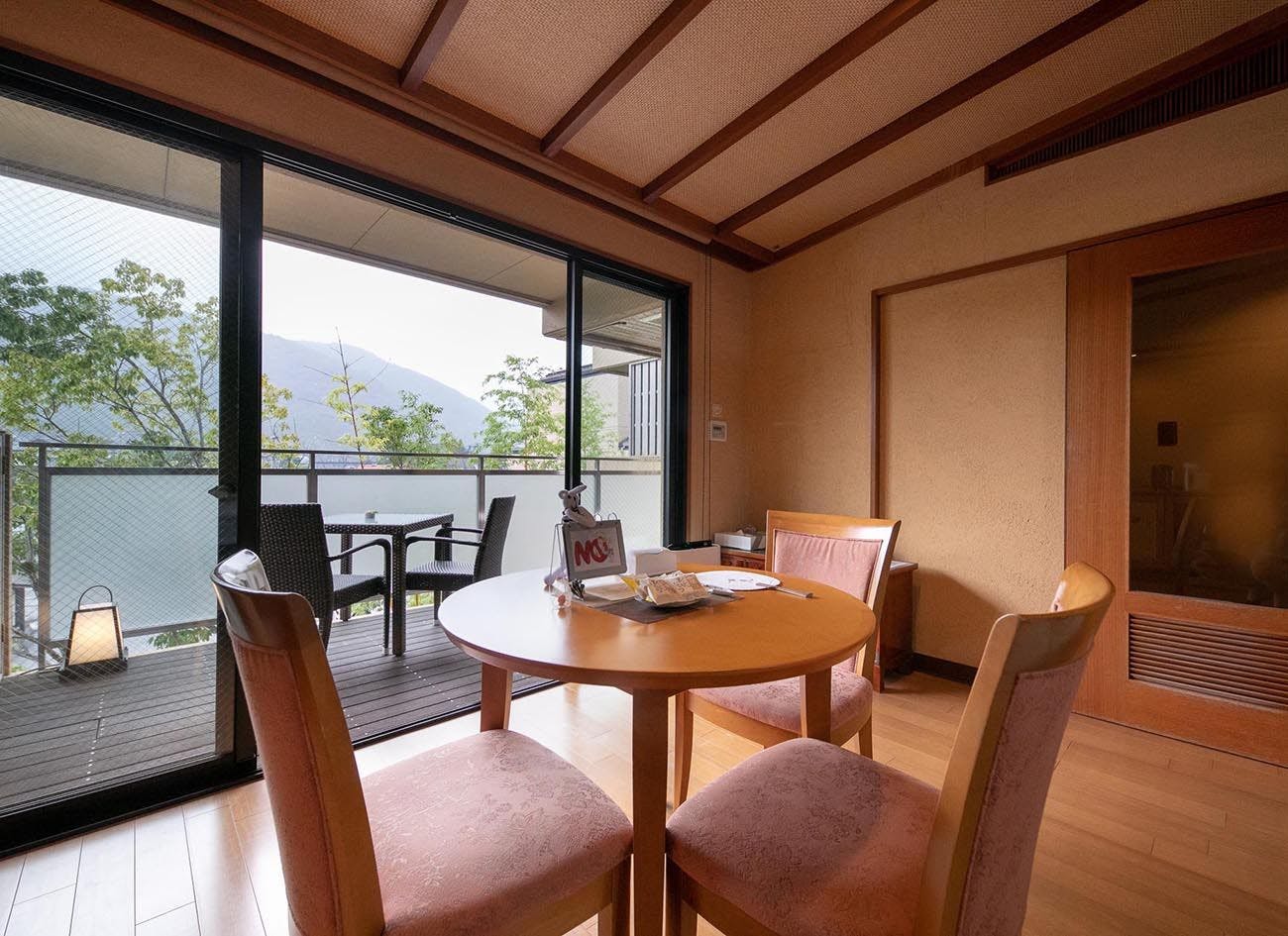 お部屋内で1階・2階に分かれ、和室8帖+洋間19.8平米のそれぞれが広々とした空間が楽しめるお部屋です。お部屋からは由布岳を一望!冬景色も新緑も紅葉もこちら