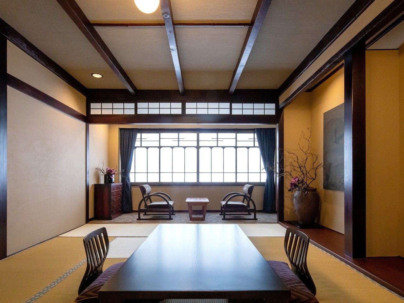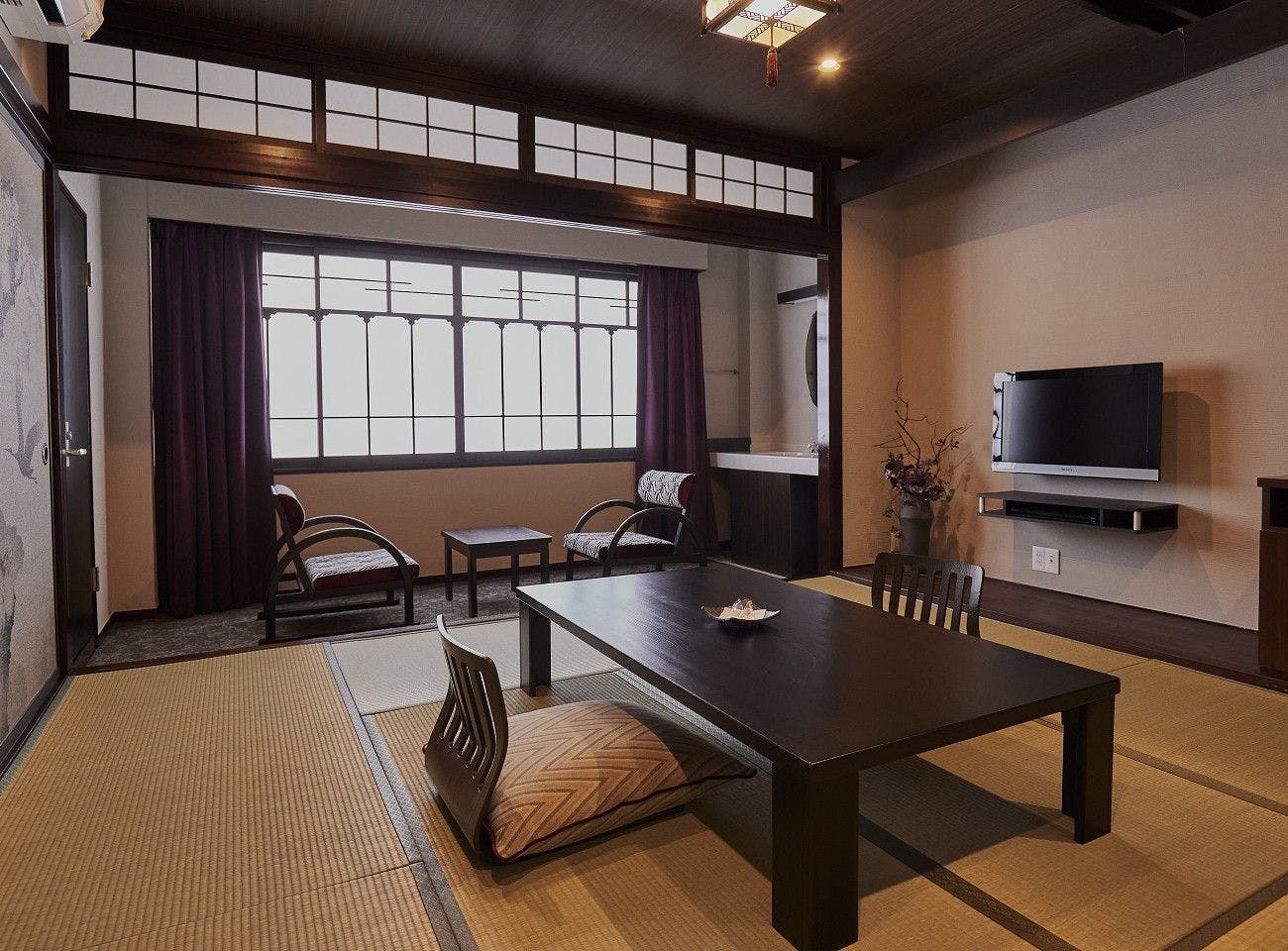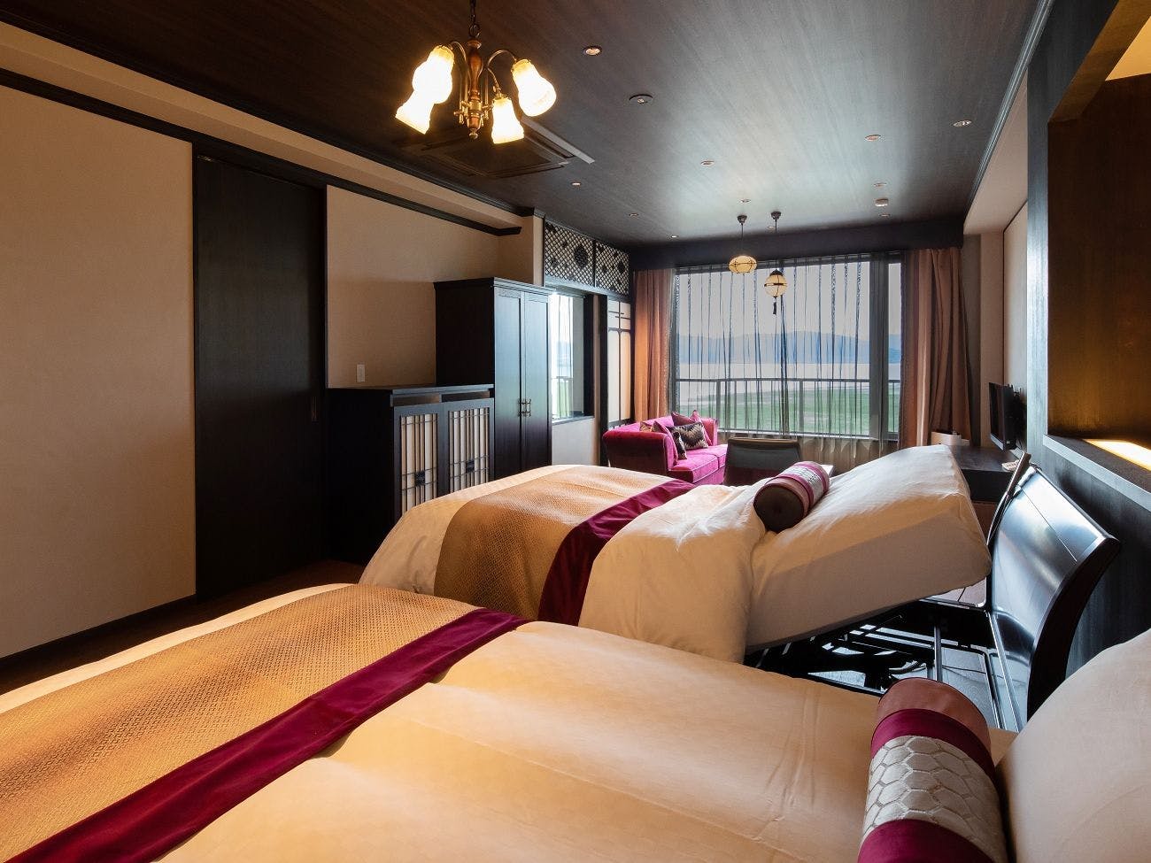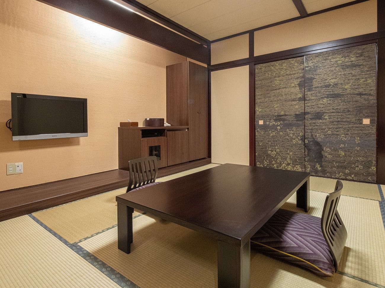 お部屋の内装を一部新しくし、スイートルームでも使用している京和紙に描かれた水墨画の襖や上質なファブリック、漆を使用した家具を取り入れました。