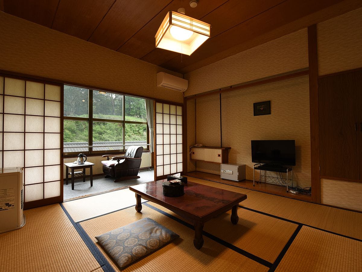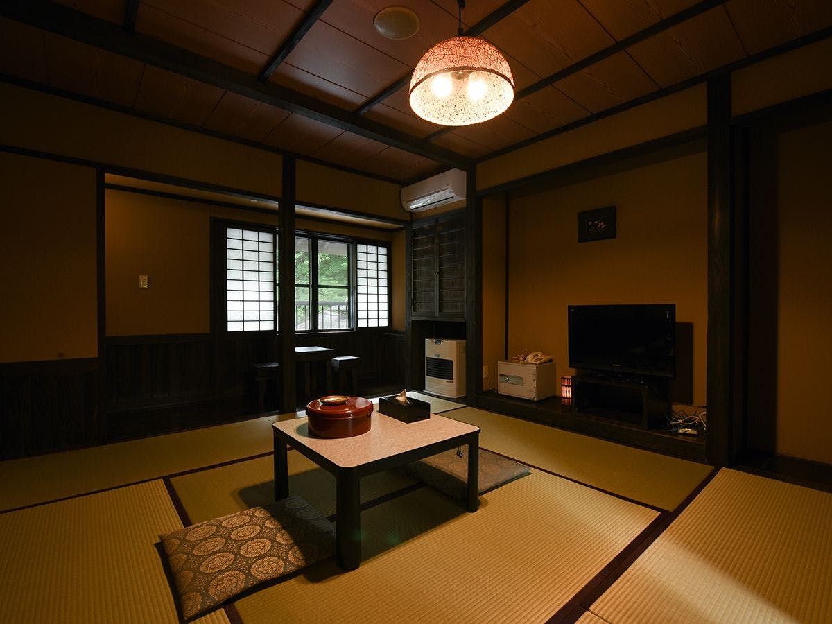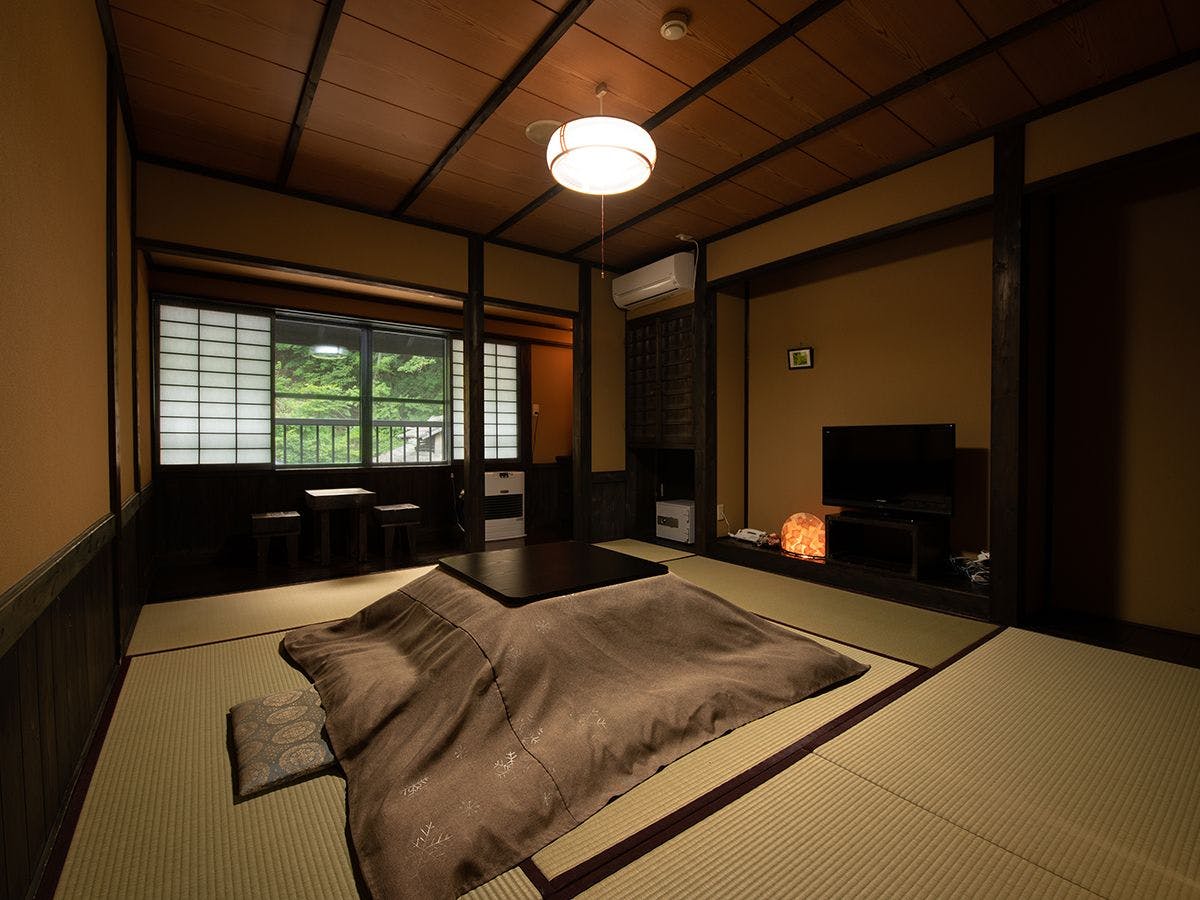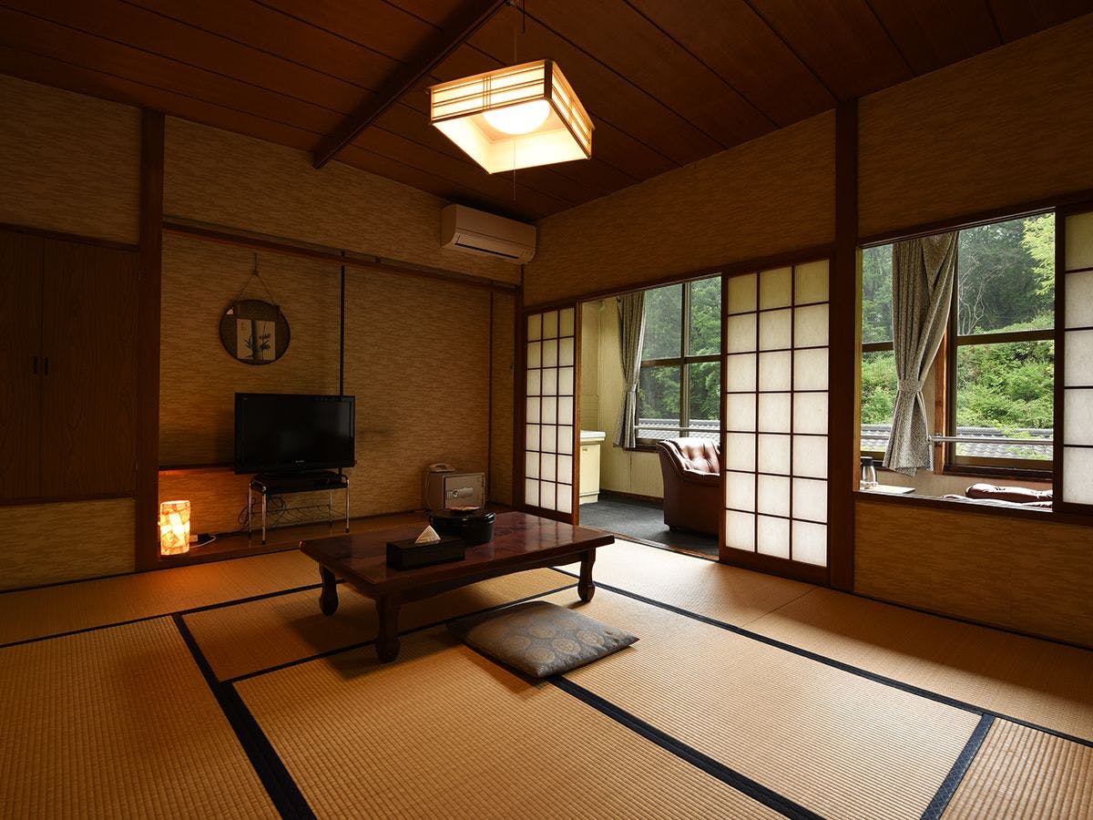 昔ながらの懐かしいお部屋。中庭と小川を臨む窓辺でゆったりと…。※バストイレなし、洗面あり