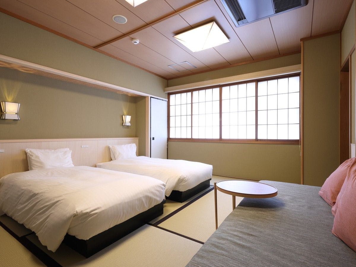 2019年2月リニューアル! Wi-Fi接続無料和室にベッド2台とソファーベッド1台を配置した和モダン客室です。落ち着いた畳でのんびりお過ごしください。■設備バス・ウォシュレットトイレ(セパレート型/洗面台独立)/冷蔵庫/エアコン