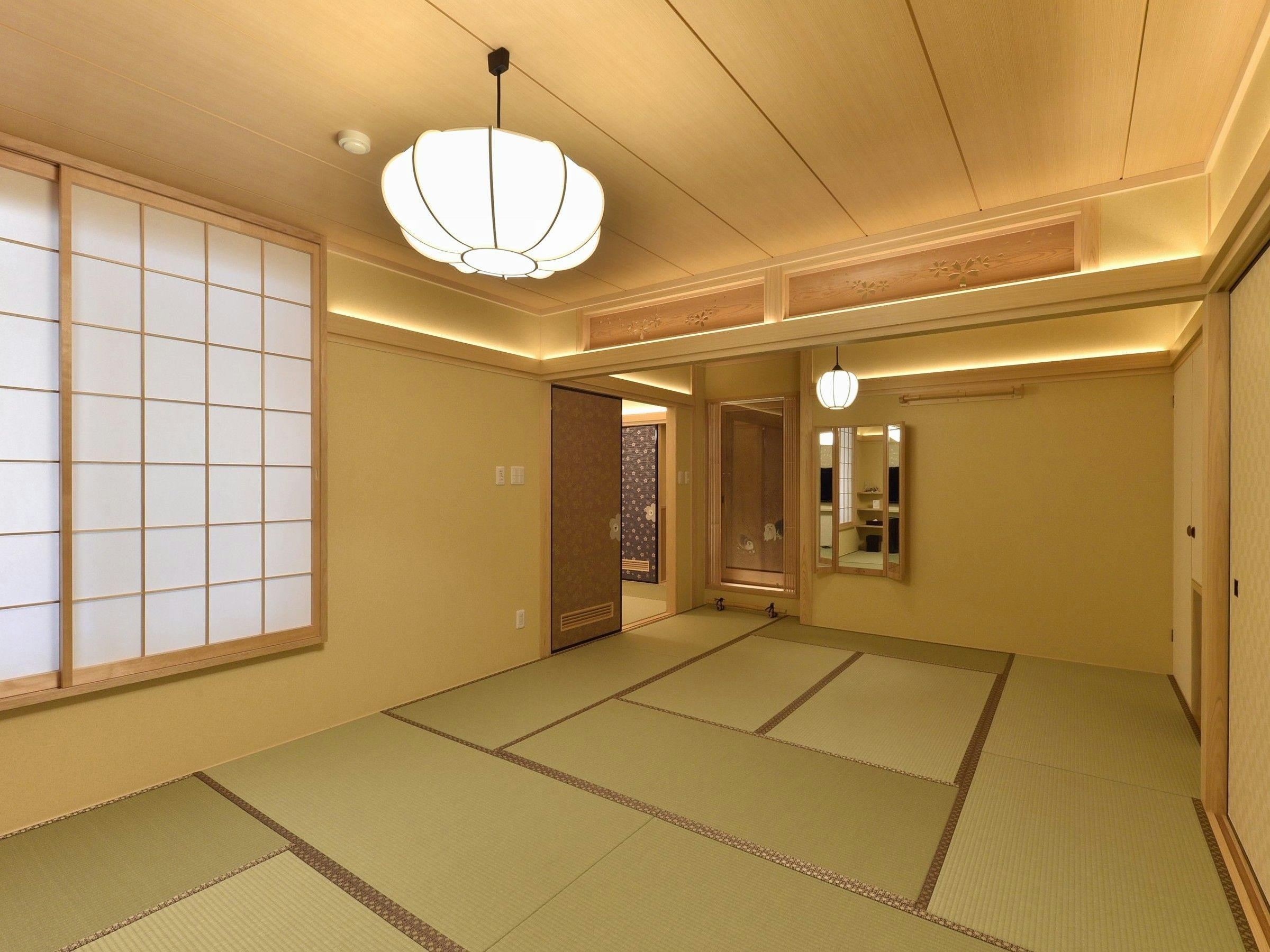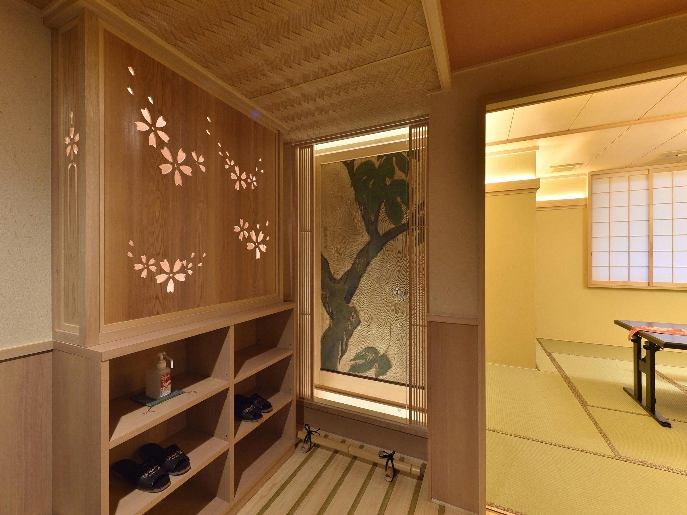 最上階に位置する八重桜の間は、2間続きの贅沢な特別室。杉戸絵をあしらった入り口から、京に住まうような空間が広がります。客室のお風呂は、リクシル最上級スパージュのオーバーヘッドシャワー。湯船に浸かると、テレビを見ながら肩湯をお楽しみいただけます。首から肩に、優しいお湯をまとうかのような新感覚の肩湯。肩湯とジェットバスで、贅沢なバスタイムもお過ごしいただけます。