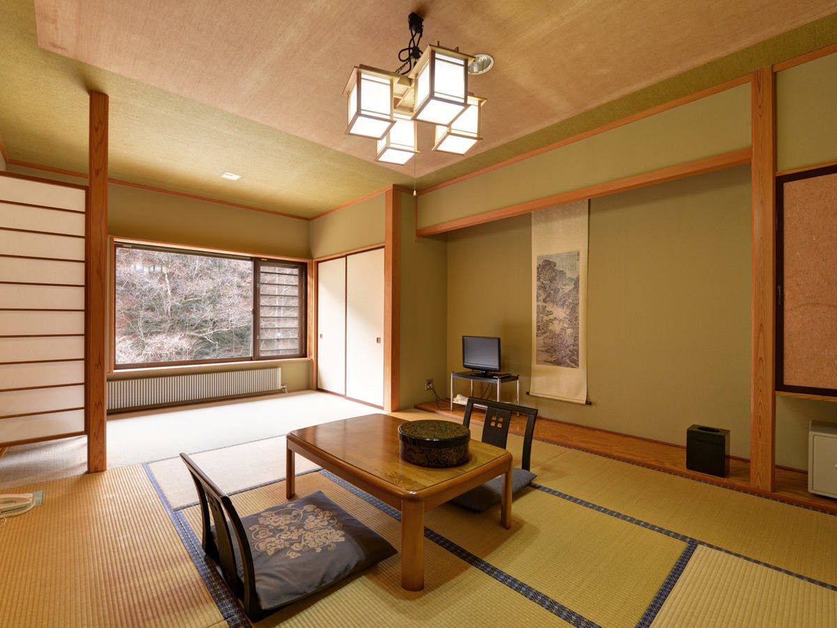 和室8畳のお部屋にツインベッドを配置しました。また、窓側の広縁にイス・テーブルをご用意しました。エアコン・テレビ・冷蔵庫・トイレ(洗浄機能付)。これまで高齢者の方を中心にベッドのご要望が多く寄せられておりました。湯治(温泉療養)のお客様はもちろん、そのほかの方でもご利用いただけます(※室内に段差はあります)。