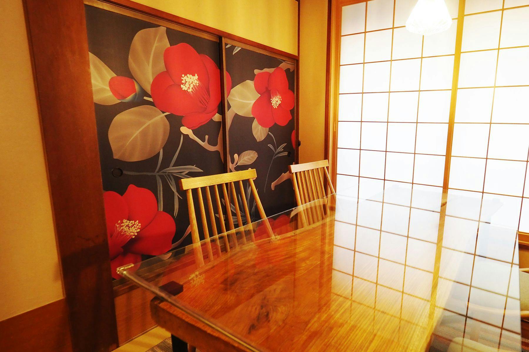 伝統的な和の設えに和洋アンティーク家具や照明、ケヤキの一枚板のテーブル、ノスタルヂックな襖絵、そして現代アート家具が融合し、どこか懐かしいけれど、初めて出会う特別な空間です。