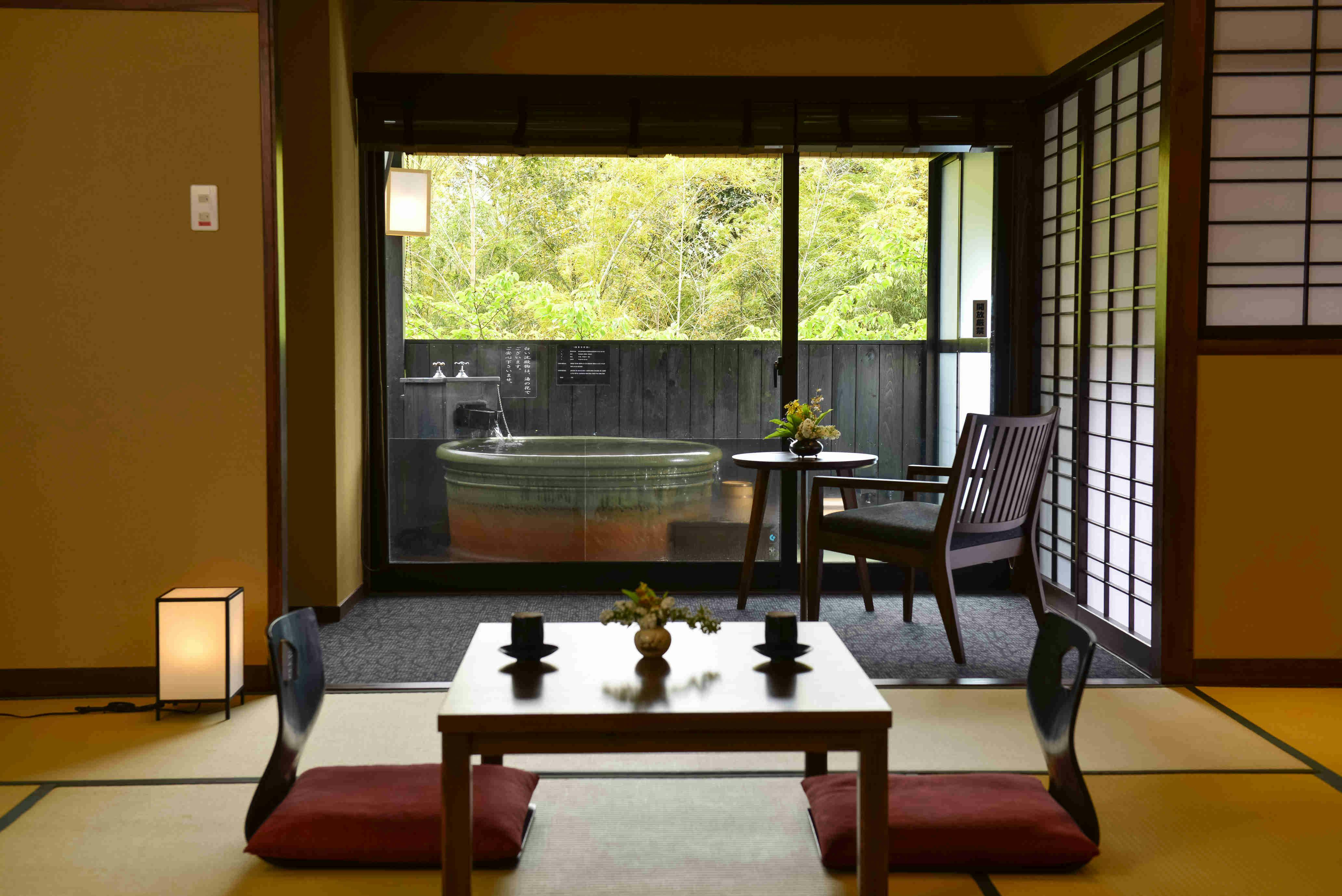 源泉かけ流し露天風呂と緑の景色が日々の喧騒を忘れさせ、