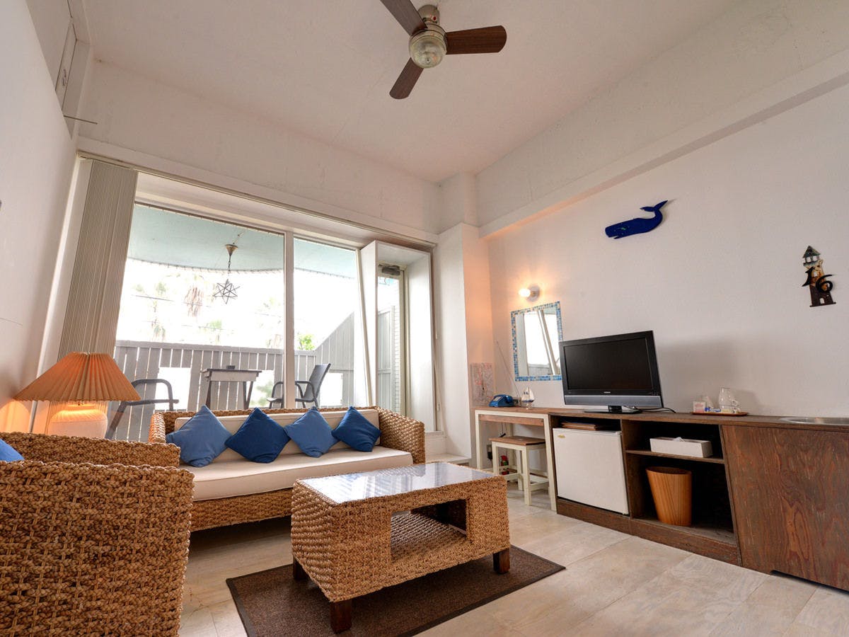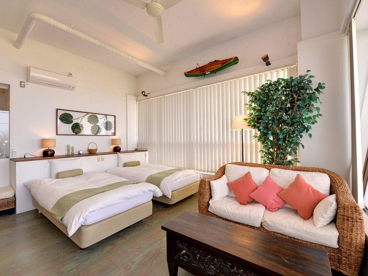 大きな窓いっぱいに広がる椰子の木ごしの海。